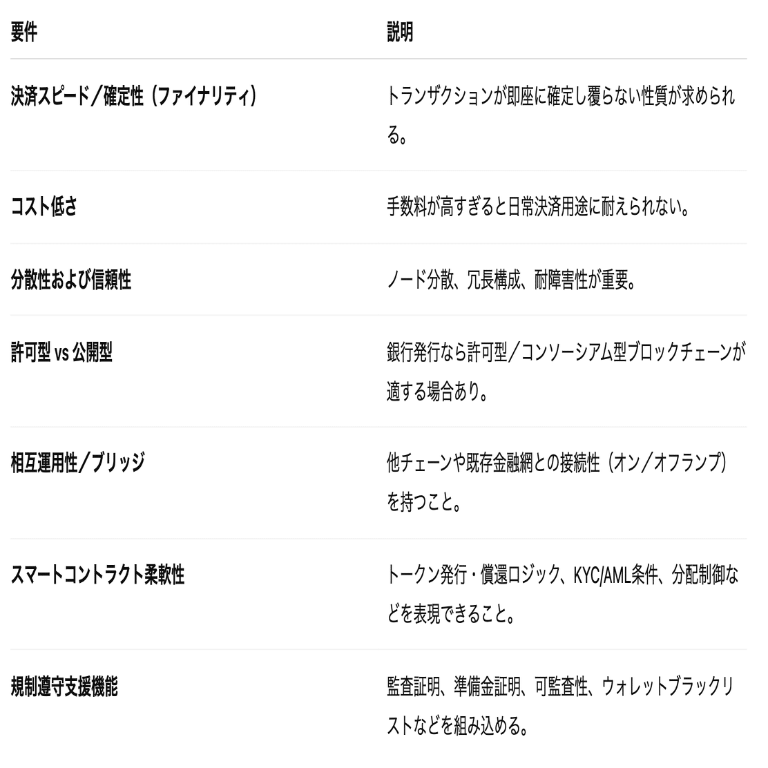 まず、信用組合型ステーブルコインを設計するときに重視される要件を整理しておきます(これらを満たせるチェーン・技術が有力候補になるかと)