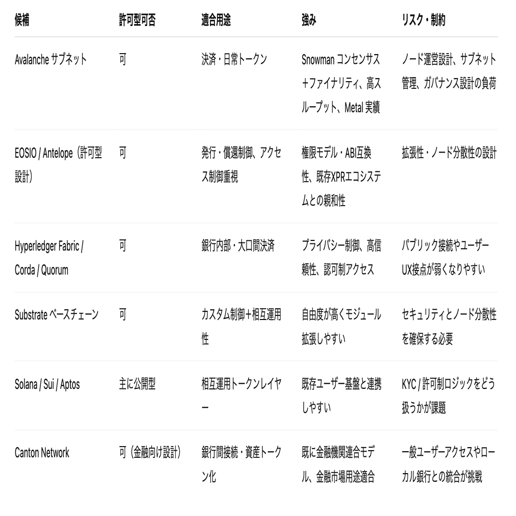 信用組合型ステーブルコインに導入しうるチェーン候補と、それぞれがどの用途に強いかの目安はこんな感じです。
