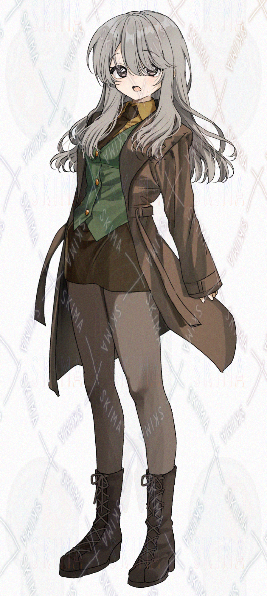 ふわふわ灰髪、ブラウンのトレンチコートを着た女の子です。キャラ設定はご自由に。