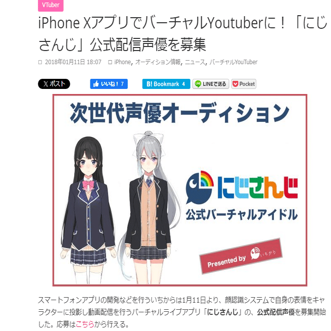 いちから株式会社は2018年1月11日に、スマートフォンアプリ「にじさんじ」の、公式配信声優の募集を開始した。