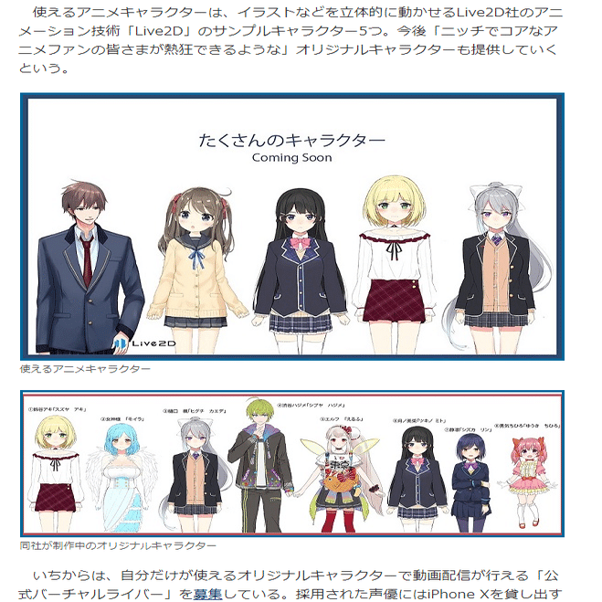 このアプリは「Live2D」と呼ばれる、2Dアニメーション技術によって、誰でも美少女バーチャルYouTuberになれると銘打った。