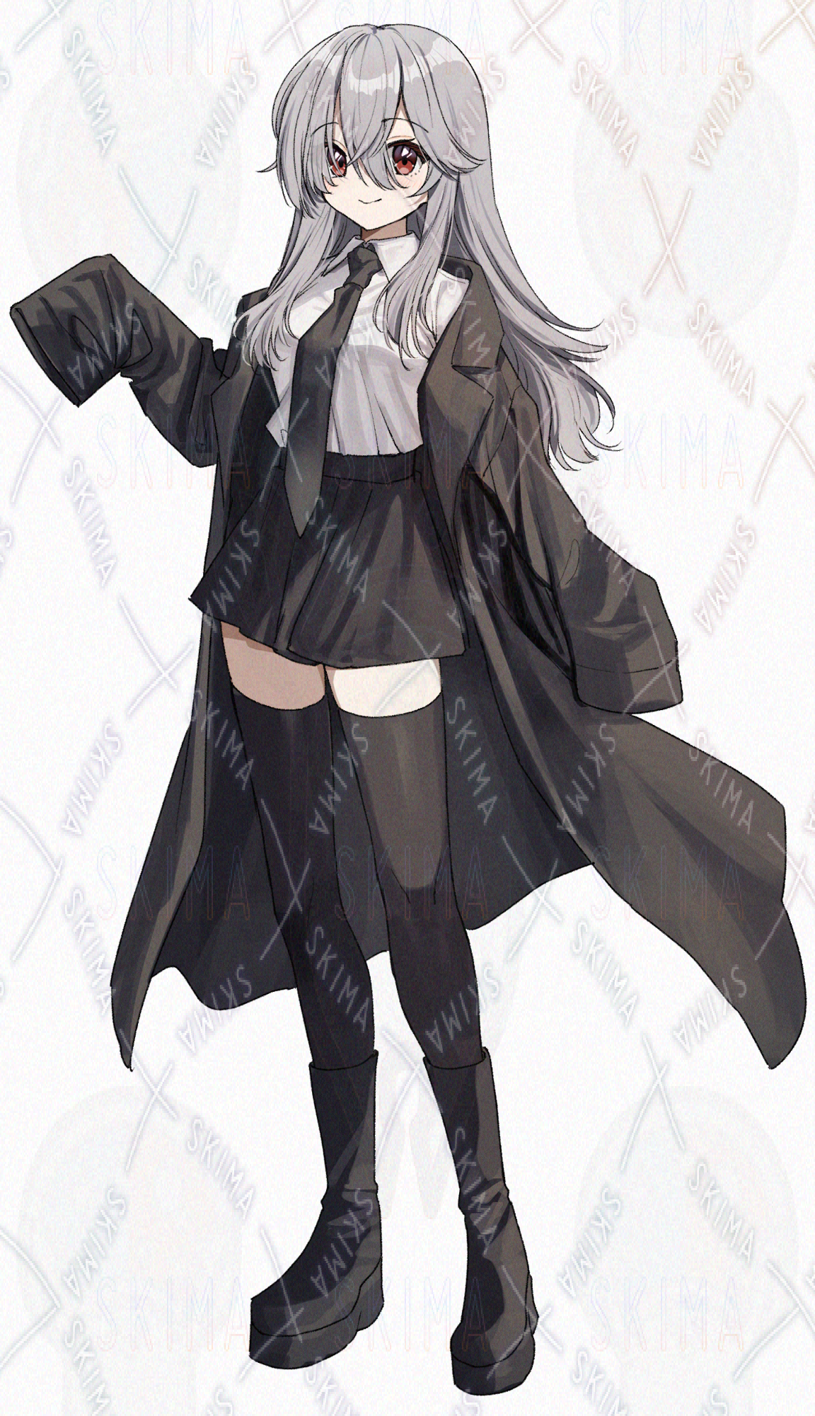 白灰髪、黒のロングコートの女の子です。キャラ設定はご自由に。