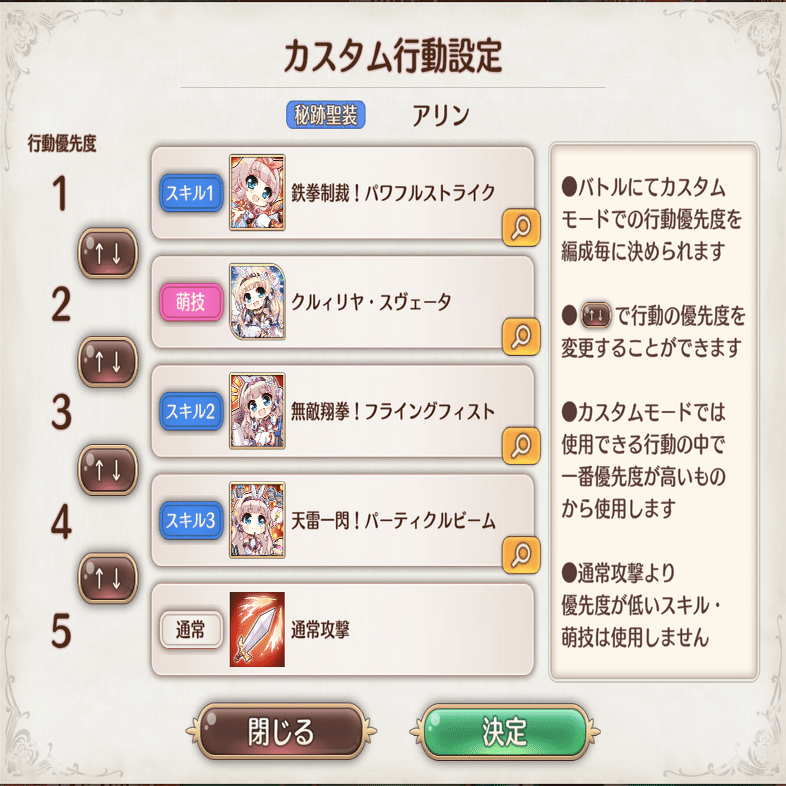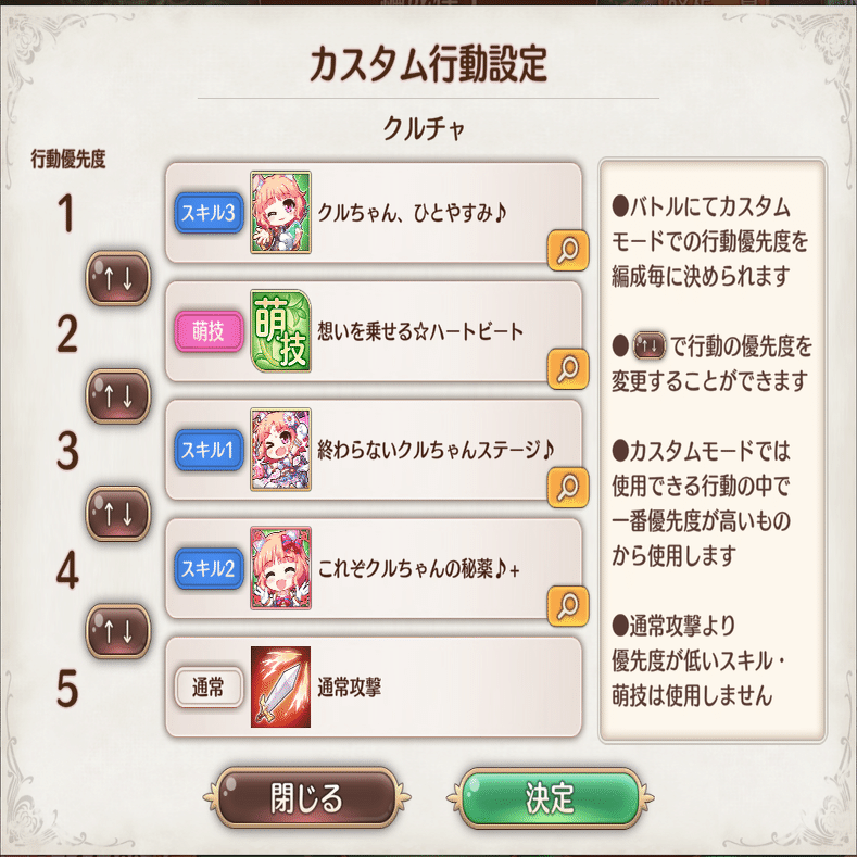 カスタム行動設定は萌技→スキル1→スキル2の基本設定。