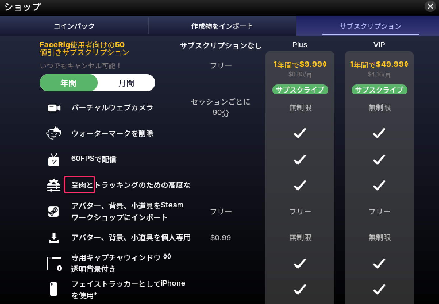 あ、そうそうVIP版のサブスクリプションて、Plus版と機能には違い無さそうだけど何が違うんだろう。。。