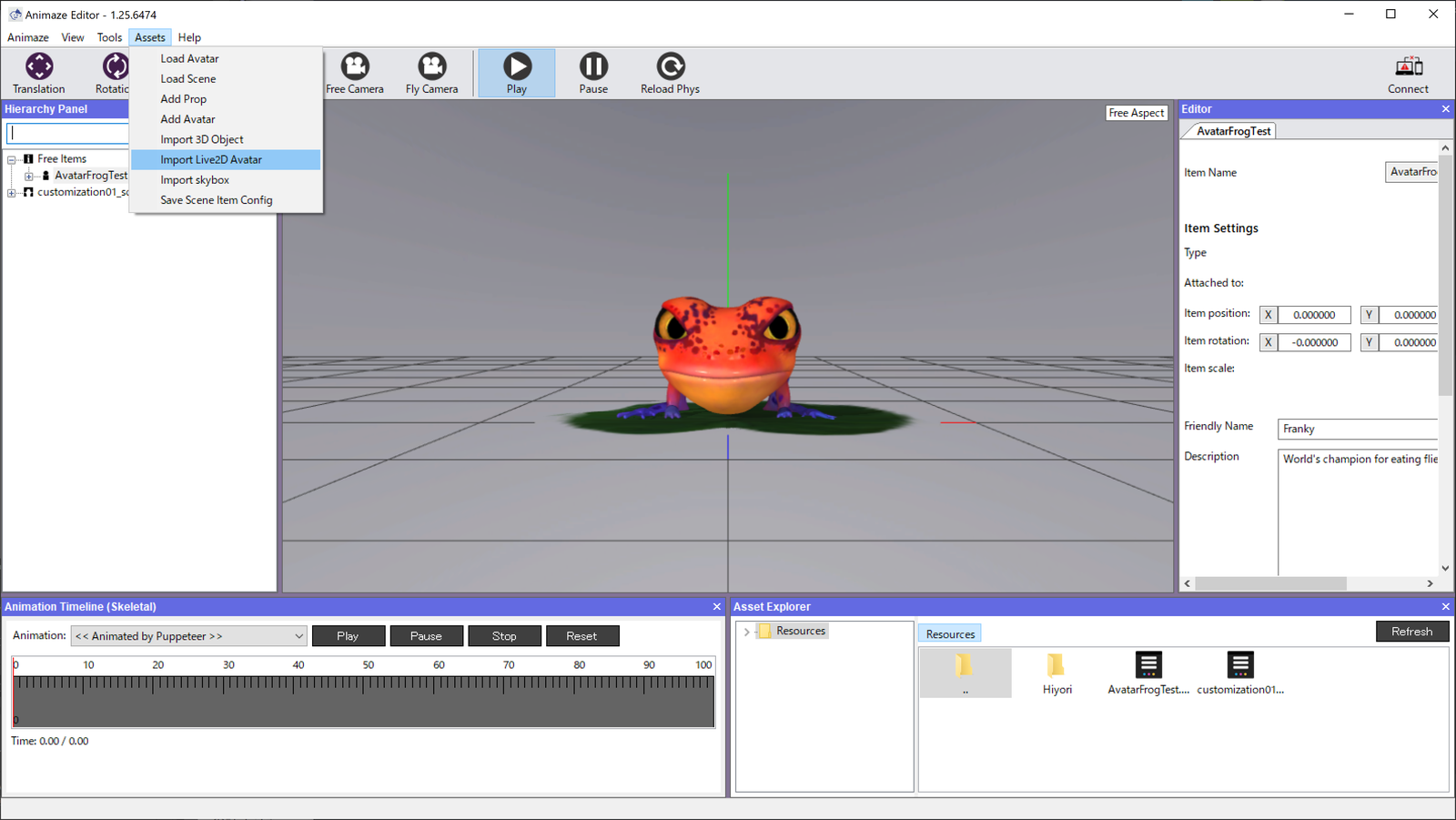 ① 『Animazeエディター』のメニューから、【Assets】>【Import Live2D Avatar】を選択して、Facerigで使っていたモデル(.model3.json)をインポートします(↓)