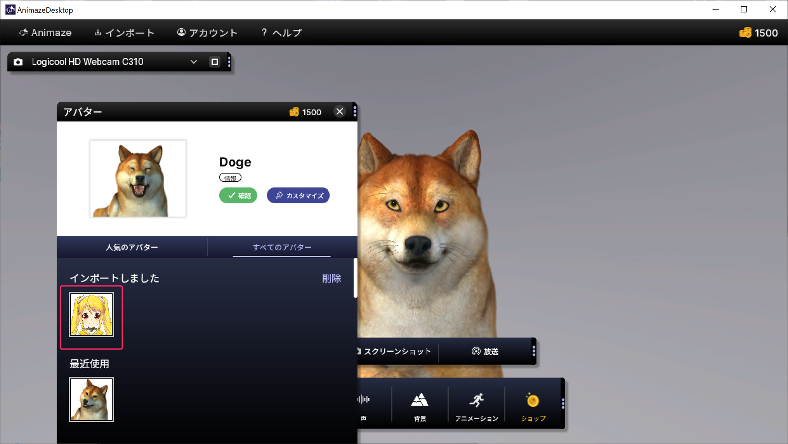 ③ Animaze本体にアバター(.avatar)をインポートする。
