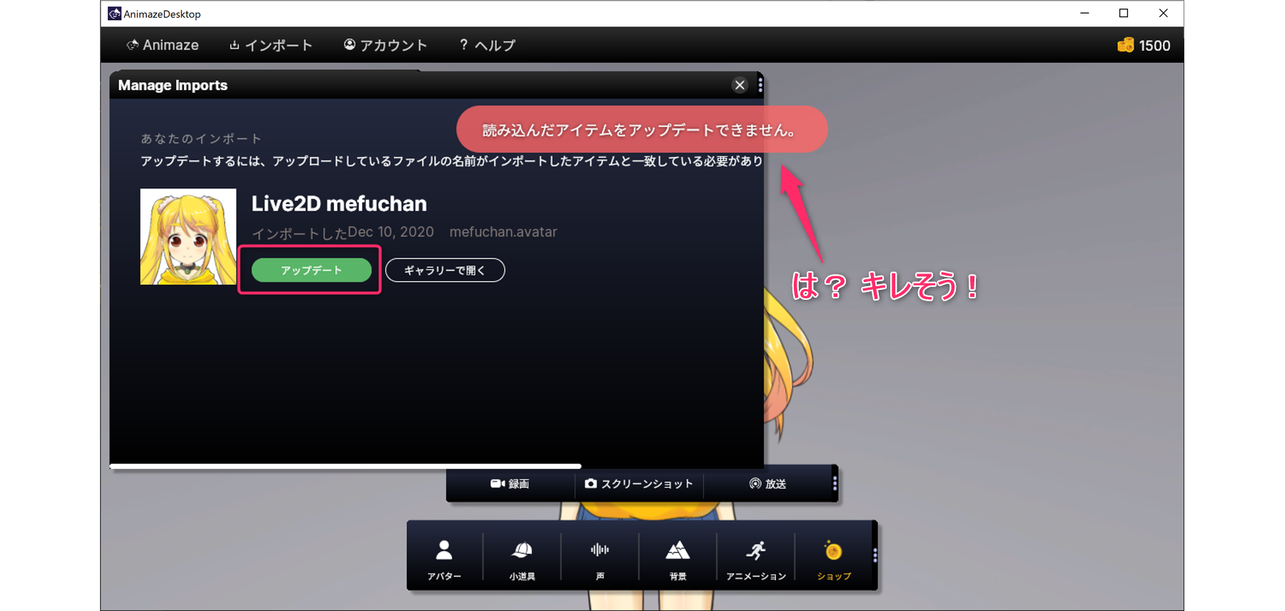 これなんかのバグなんですかね。 Animazeにインポートしたアバターは下記のパスに置かれていたので、そこの mefuchan.avatar を直接消してから「アップデート」したらちゃんと更新できました。