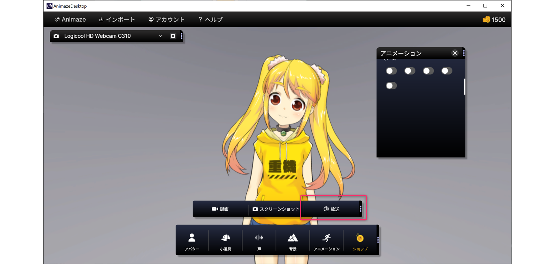 あとは、Animaze本体側で【放送】ボタンをクリックすれば、OBS側に映像が流れます。