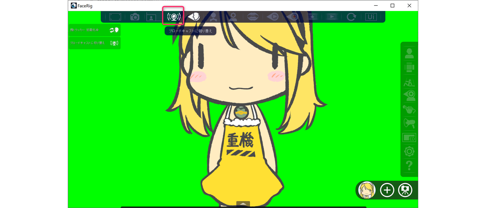 使い方はまず、Facerigの画面で「ブロードキャストに切り替え」をクリックしてもろて。。。