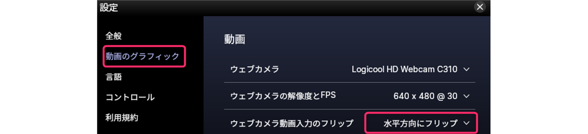 これについては『Animaze本体』のメニューから【Animaze】>【設定】を選択して、【動画のグラフィック】のところで【ウェブカメラ動画入力のフリップ】を「水平方向にフリップ」すれば期待通りに動くようになりました。