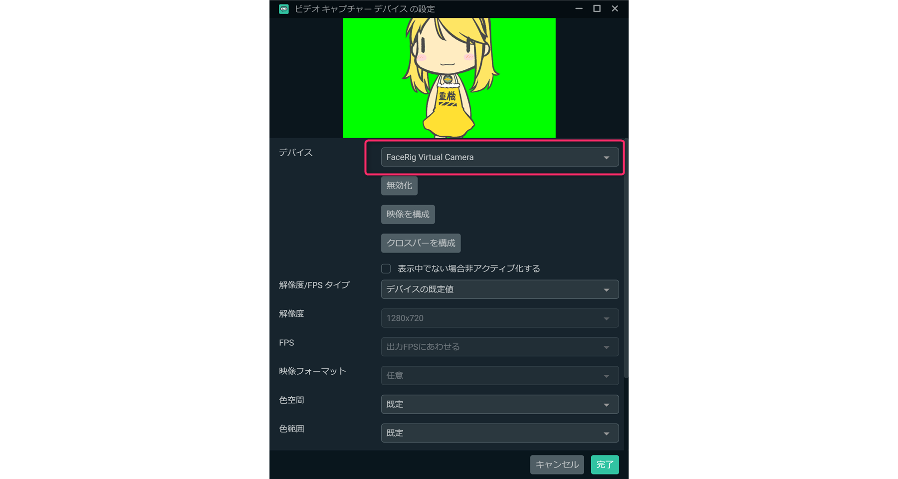 そして、SLOBSでは「ビデオキャプチャーデバイス」をソースに追加してデバイスとして「FaceRig Virtual Camera」を選択すればOKです。