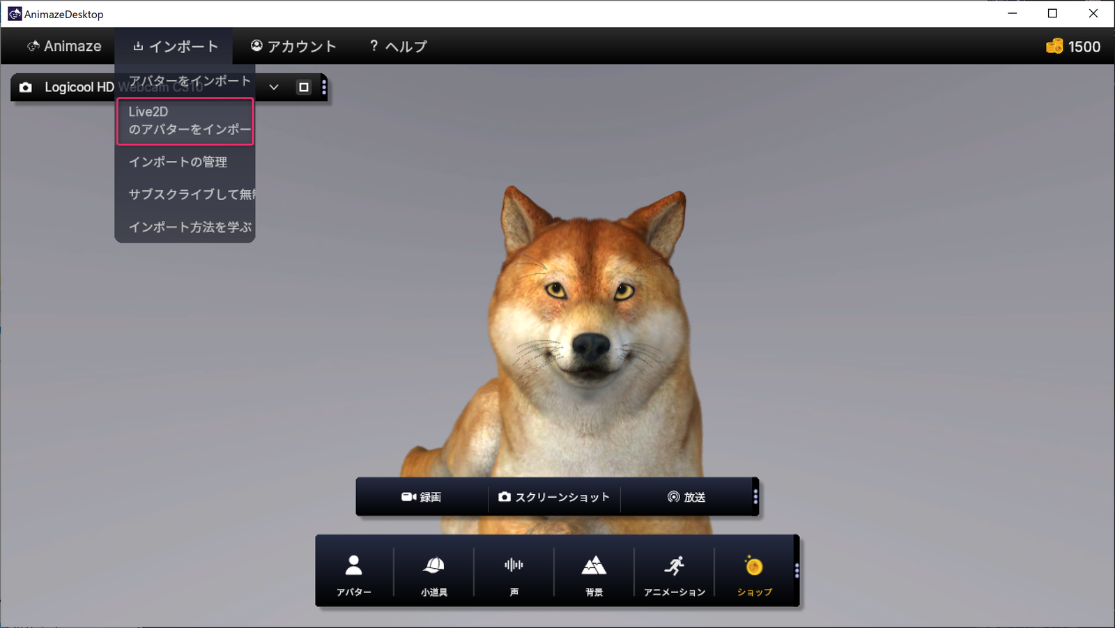 ③ .avatarファイルができたら、今度は『Animaze本体』のほうで【インポート】>【Live2Dのアバターをインポート】を選択(↓)