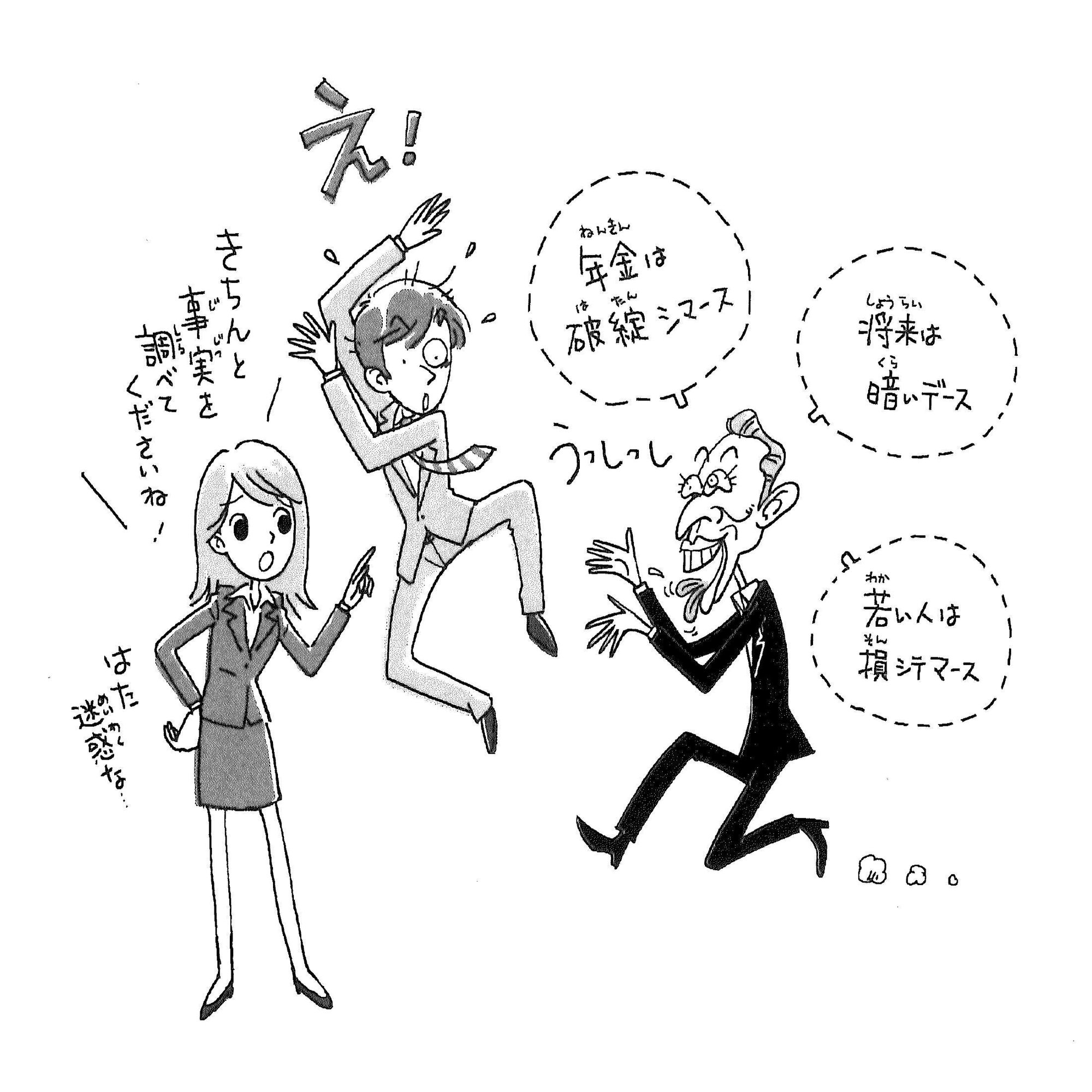権丈:右側からセールスマンが「年金は破綻シマース」、「将来は暗いデース」、「若い人は損シテマース」と若者に近寄ってくる。すると、若者は「え!」と飛び上がってびっくり。すると、若者の隣にいる女性、佐藤さんかな、彼女が「きちんと事実を調べてくださいね!」、「はた迷惑な…」とびしっと言っている。