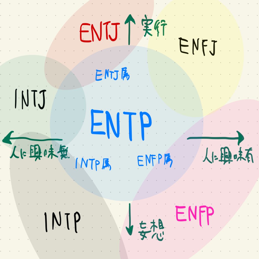 この考え方を元に、ENTPと近傍の性格を図示してみると、下のような関係になるのかなと思った。