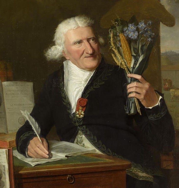 The other day, I learned that what the British call a cottage or shepherd’s pie - minced beef or lamb respectively, topped with mashed potato - is known in France as hachis Parmentier. I was vaguely aware that there’s also a dish called Parmentier potatoes (potato cubes fried in butter), so I wondered if it was the same Parmentier, and if so, whether this was a coincidence, or whether chef Parmentier just really liked potatoes. I looked him up. Le voici: