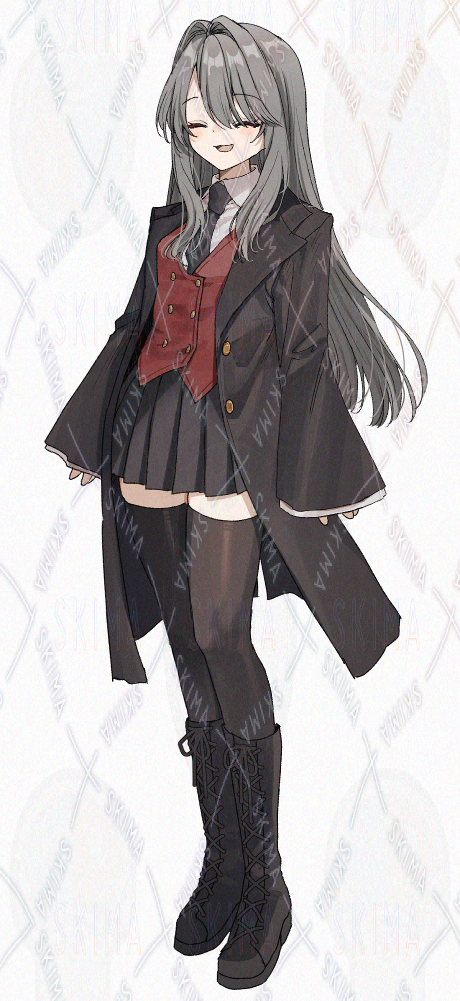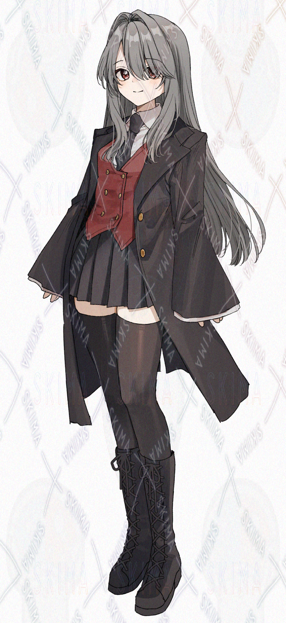 赤いベスト、黒いロングジャケットの制服を着た女の子です。キャラ設定はご自由に。