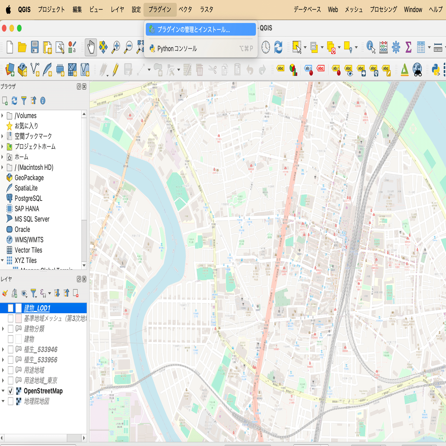プラグインの導入は、QGISを開いてプラグイン>プラグインの管理とインストールに進み、検索してインストールすれば完了です。なんと3クリックでできちゃいます。