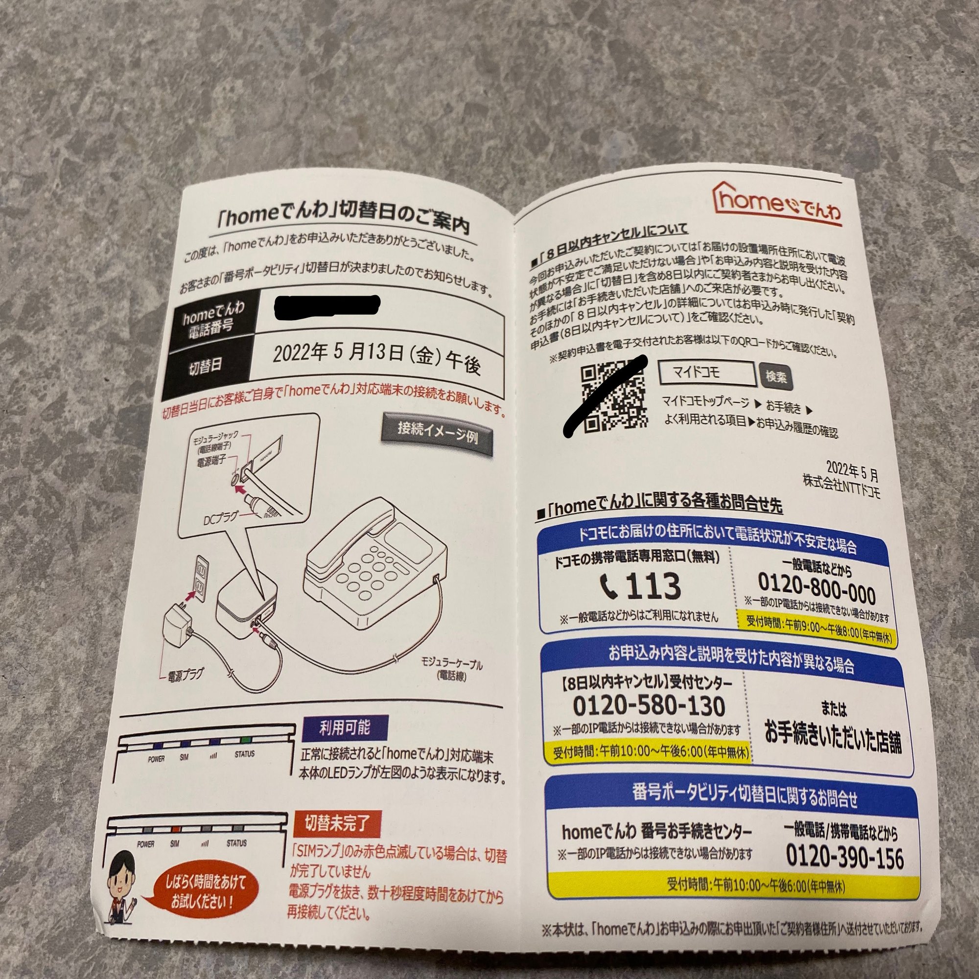 予告した時間に合わせて家電量販店に行くと、店員さんとドコモのジャンパーを着た人が出迎えてくれました。手にしていたのは分厚いマニュアル。私を席に案内し、マニュアルに沿って一つずつ手続きを進めていくのですが・・・手続きに2時間ほどかかりました。途中で「homeでんわ」に紐づくdアカウントの払い出しタイミングを誤ったり、口座振替で使う金融機関のカードを読み込んでも「対応していません」と出てきたりと、イレギュラーなことがいくつか起きました。イレギュラーがなかったとしても1時間はかかりそうです。「homeでんわ」を申し込む際は時間に余裕をもって手続きを行うことをお勧めします。