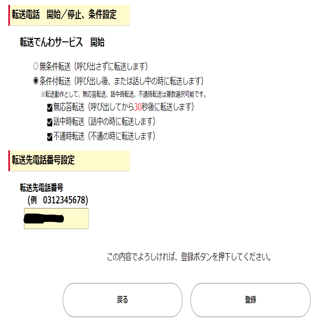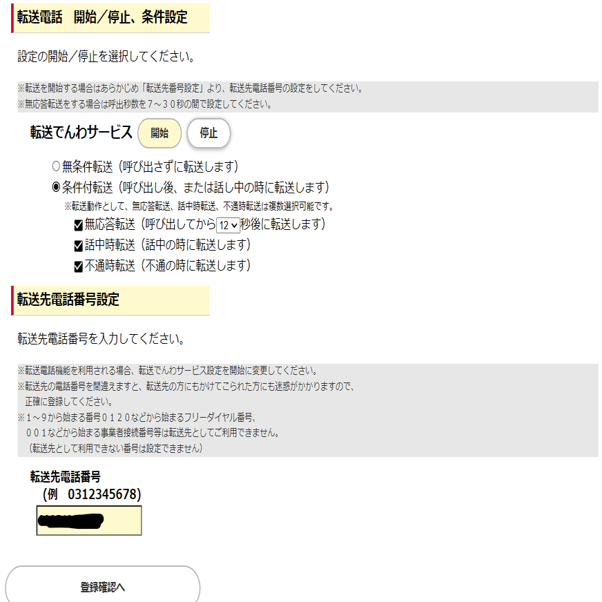 私の場合、付加機能がすべて使える「homeでんわベーシック」を契約しましたが、その契約手続きの際に「転送でんわ」の利用有無を確認し、客が使いたいと申し出があった場合に転送先の電話番号登録を行う必要があったことになります。