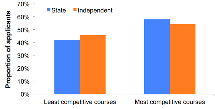 Across all subjects and both school types, 45.8% of applicants who got at least three A*s were accepted between 2010-12. If we look at the least competitive courses (i.e. subjects that took more applicants than the average), we find that 46% of the independent school applicants went for these subjects whereas 42% of state school pupils did: