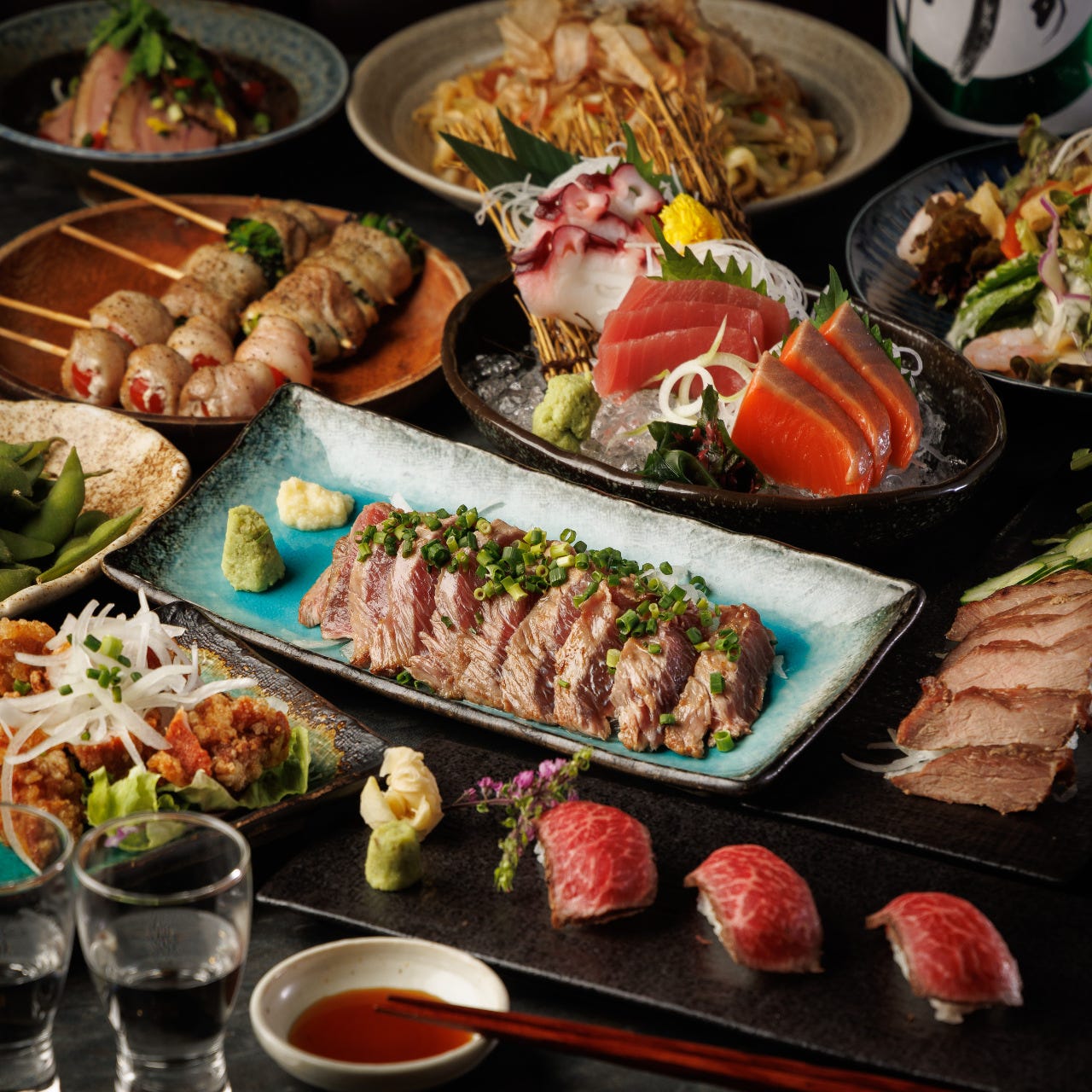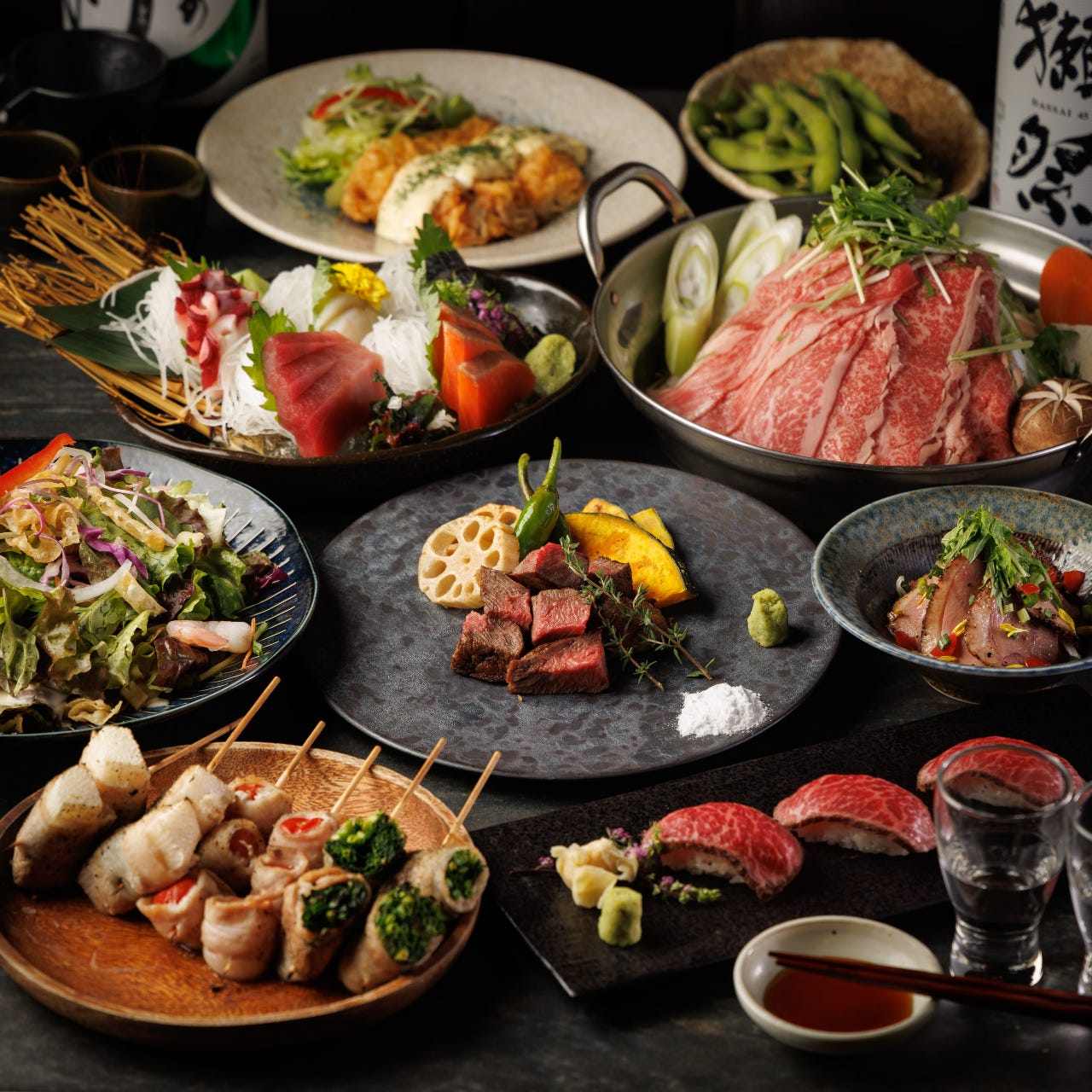 幅広い方に人気の「野菜肉巻き串」と「まぐろのほほ肉レアステーキ」がお得についたご宴会コース。もちろん、鮮魚や地鶏もお楽しみいただけます!飲み放題付で3000円~コースはご用意!