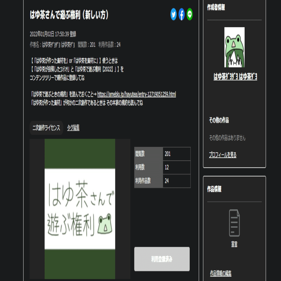 ここでいう「何かしらの投稿」というのは本当に何でもよくて、動画だけでなく、ニコニ・コモンズにテキストとして利用規約を投稿しておくことも可能です 既に「Vtuberライセンス情報リンク」「二次創作ライセンス」といったタグが誕生・使用されています
