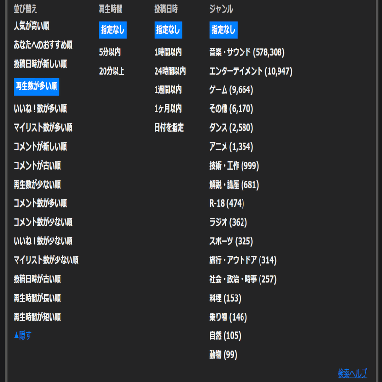 タグをクリックすると、そのタグが付けられた動画が全て表示されます さらに、再生回数・投稿日時・リスナーからの評価などで並べ替えることができた、日付を指定して特定の期間の動画を検索することができます