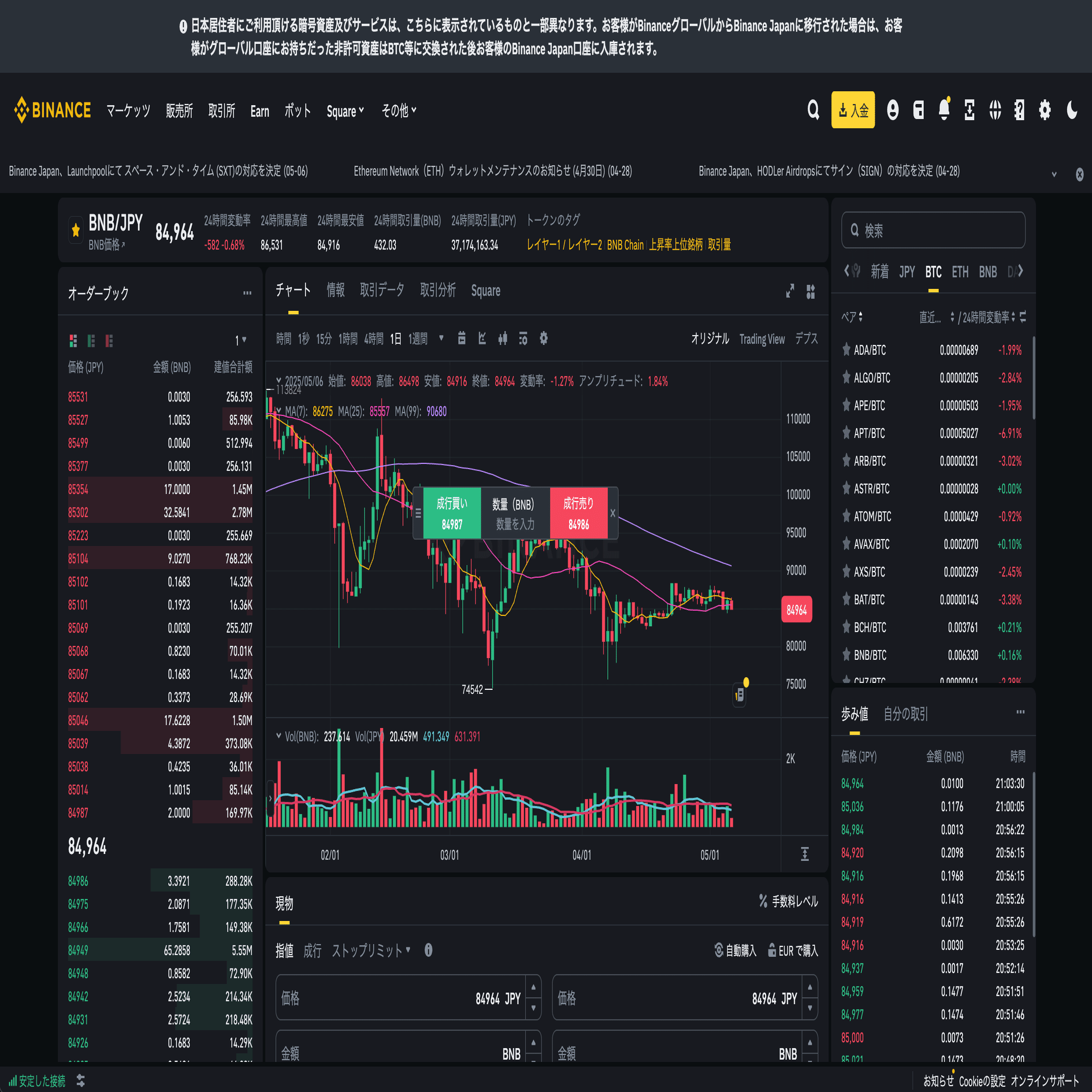 入金確認後、Binance Japanアプリ下部の「取引」をタップし、「取引所(コインの板取引)」画面を表示します。取引ペアから「BNB/JPY」などのBNBが含まれるペアを選びます。注文形式は手軽な「成行(市場)」注文でもOKです。取引数量を入力し、購入を実行します。