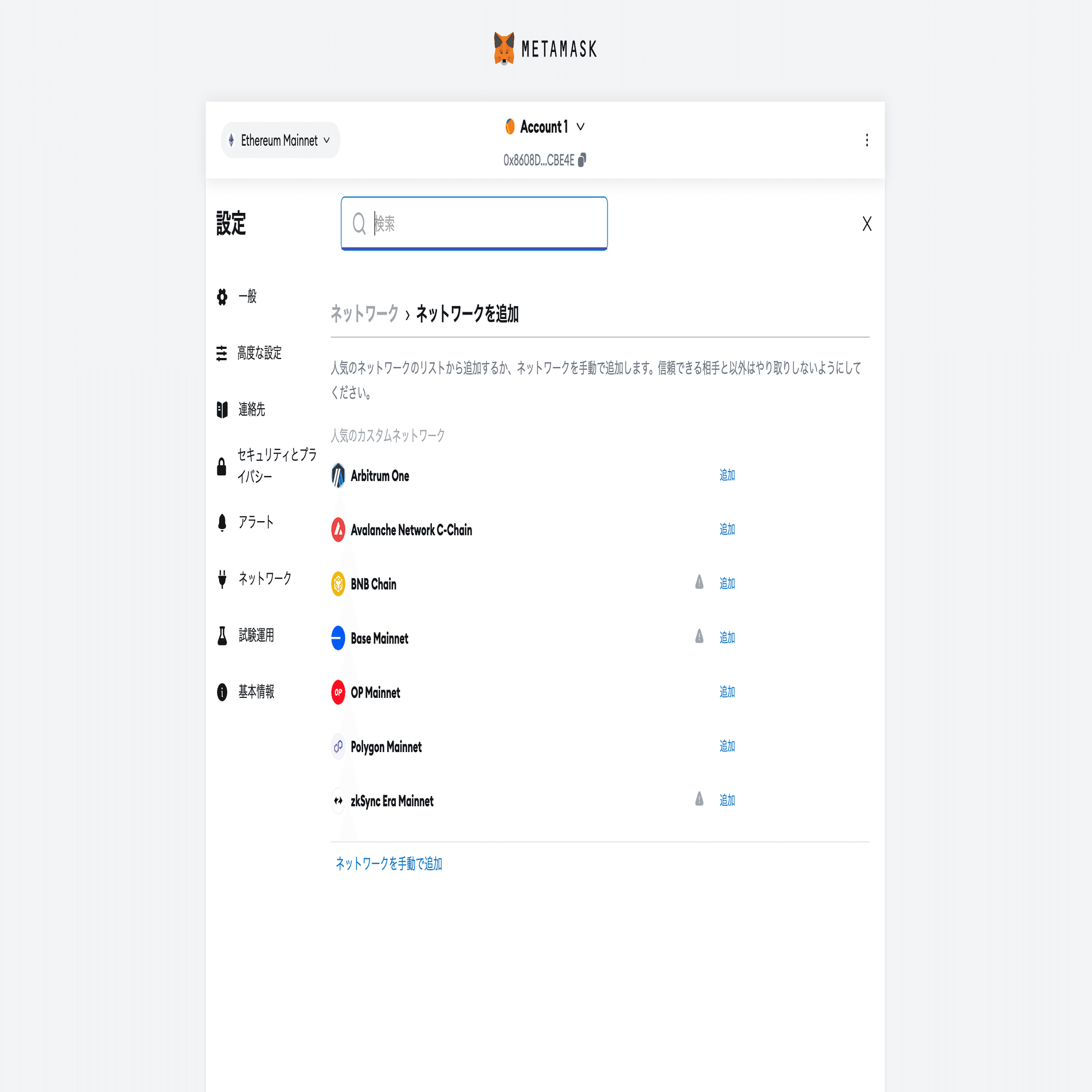 MetaMaskを開いて右上のネットワーク切替から「ネットワークを追加」をクリック