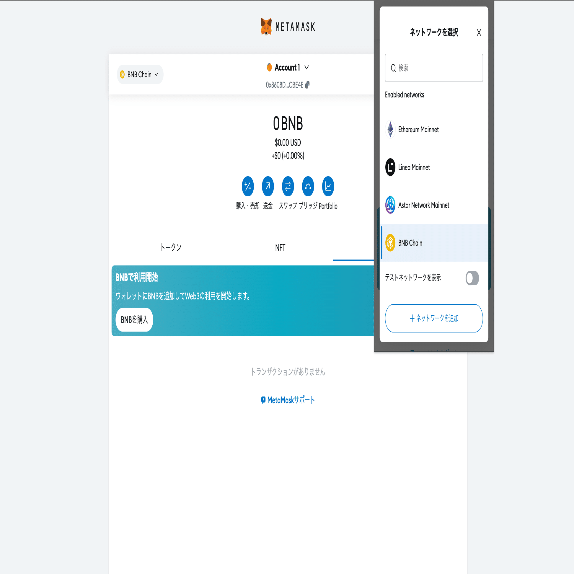 メタマスクのネットワーク選択欄にBNBが表示されていれば成功です。