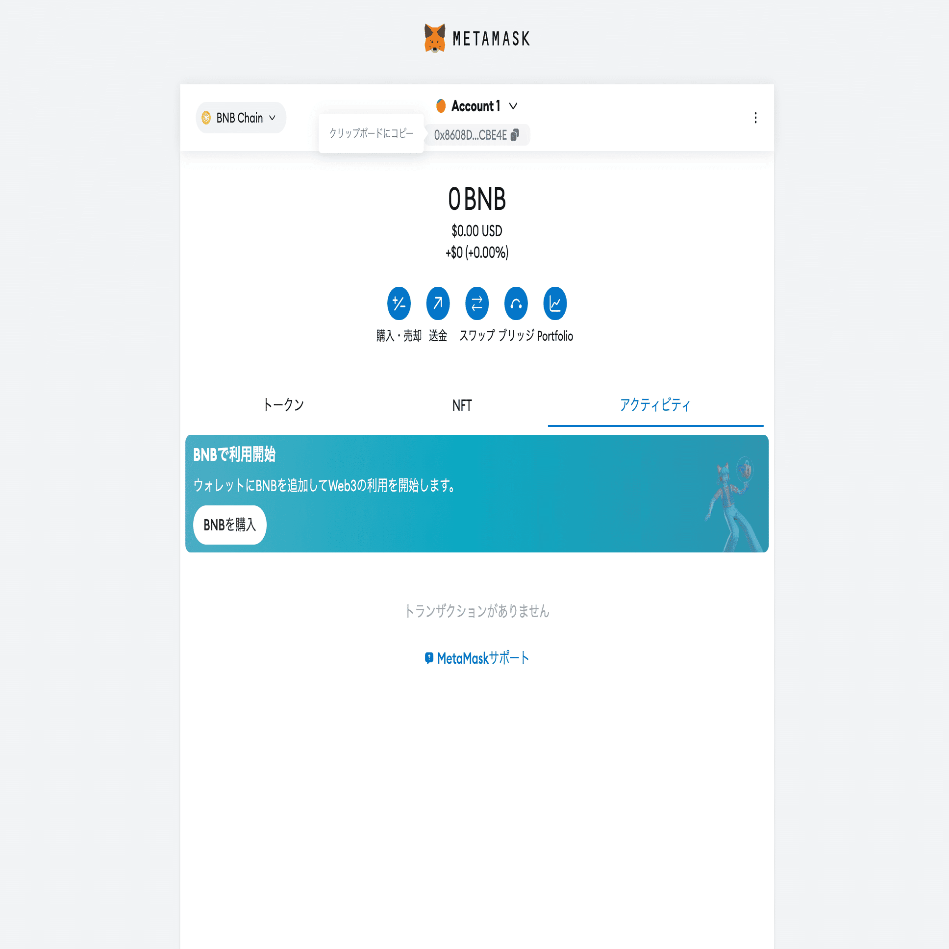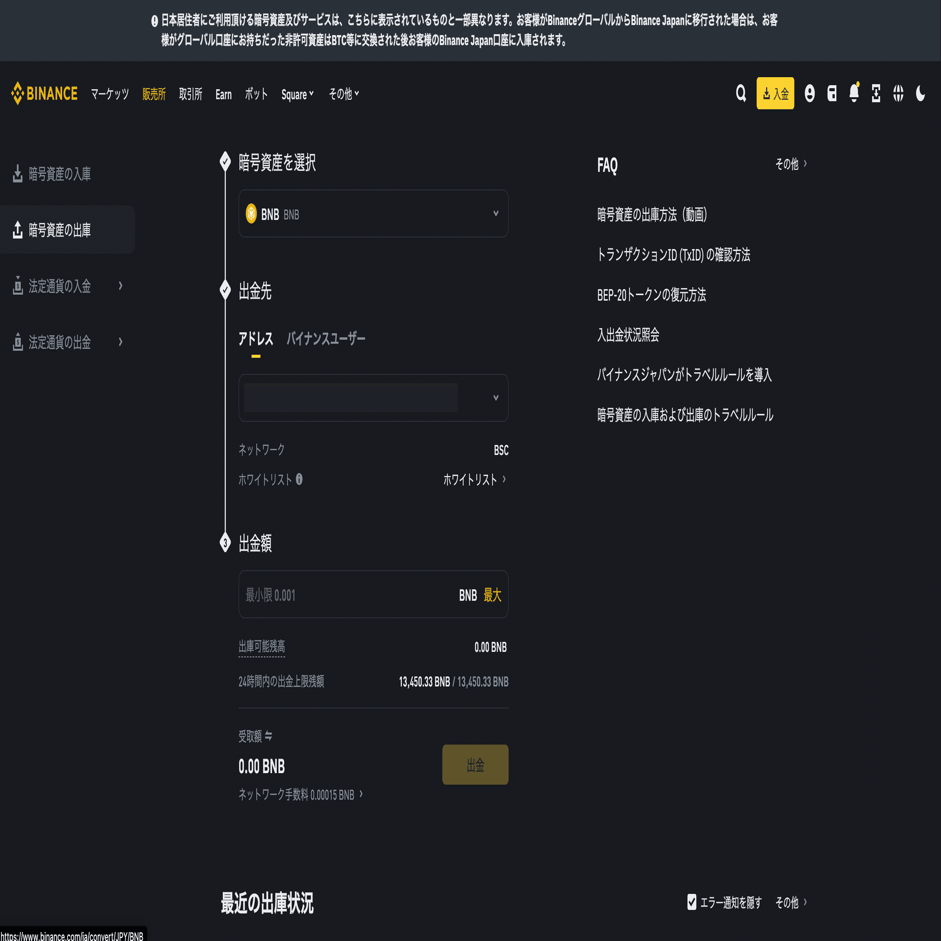 購入したBNBの送金方法。