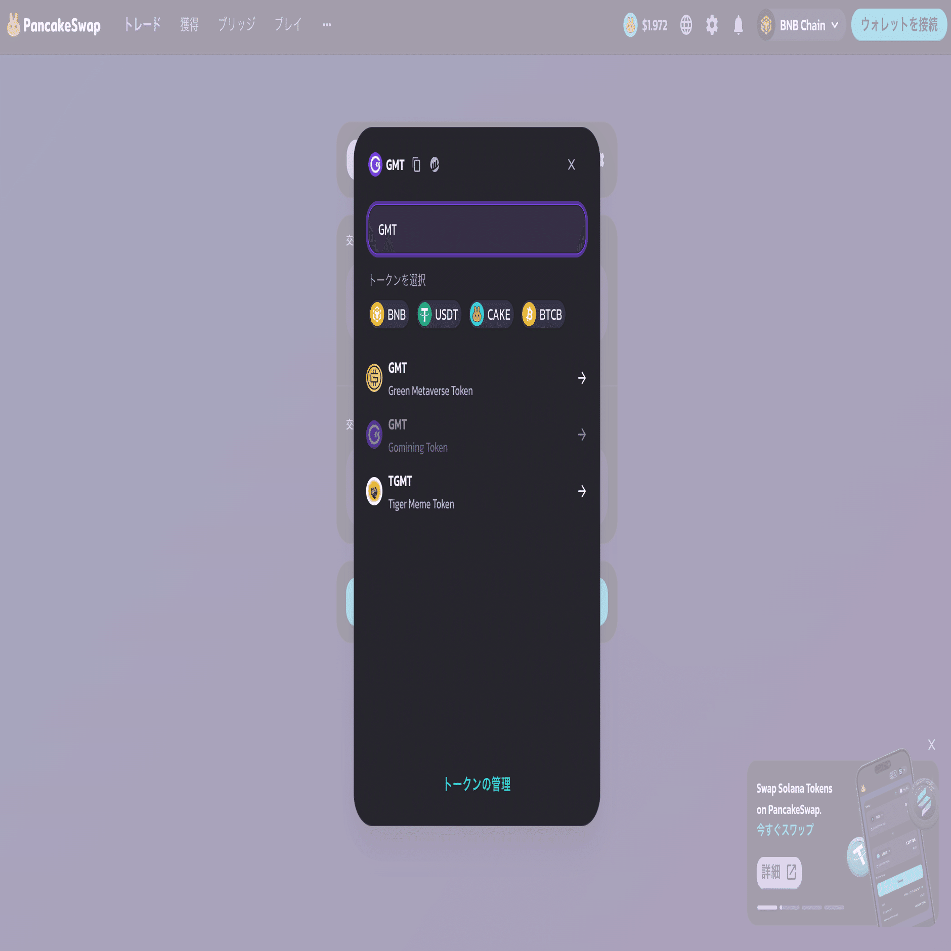 MetaMask接続後、PancakeSwap画面のメニューから「Trade > Swap(取引 > スワップ)」を選択します。左上の「From(交換元)」トークンでBNBを選び、右下の「To(交換先)」トークンで「GOMINING(GMT)」を選択します。