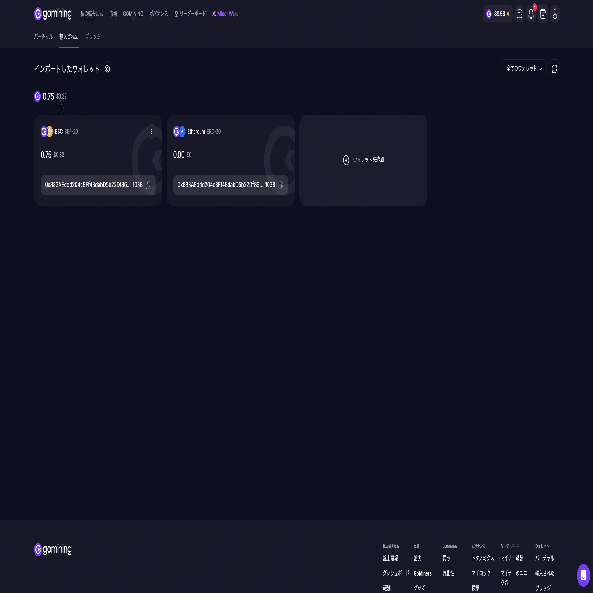 これでMetaMaskウォレットがGominingアプリに登録され、そのアドレスのGOMININGトークン残高がアプリに表示されます 。実際には先ほどスワップしたGOMININGトークンはすでにそのアドレスに保管されているため、アプリを再読み込みすることで新トークンが反映されます。