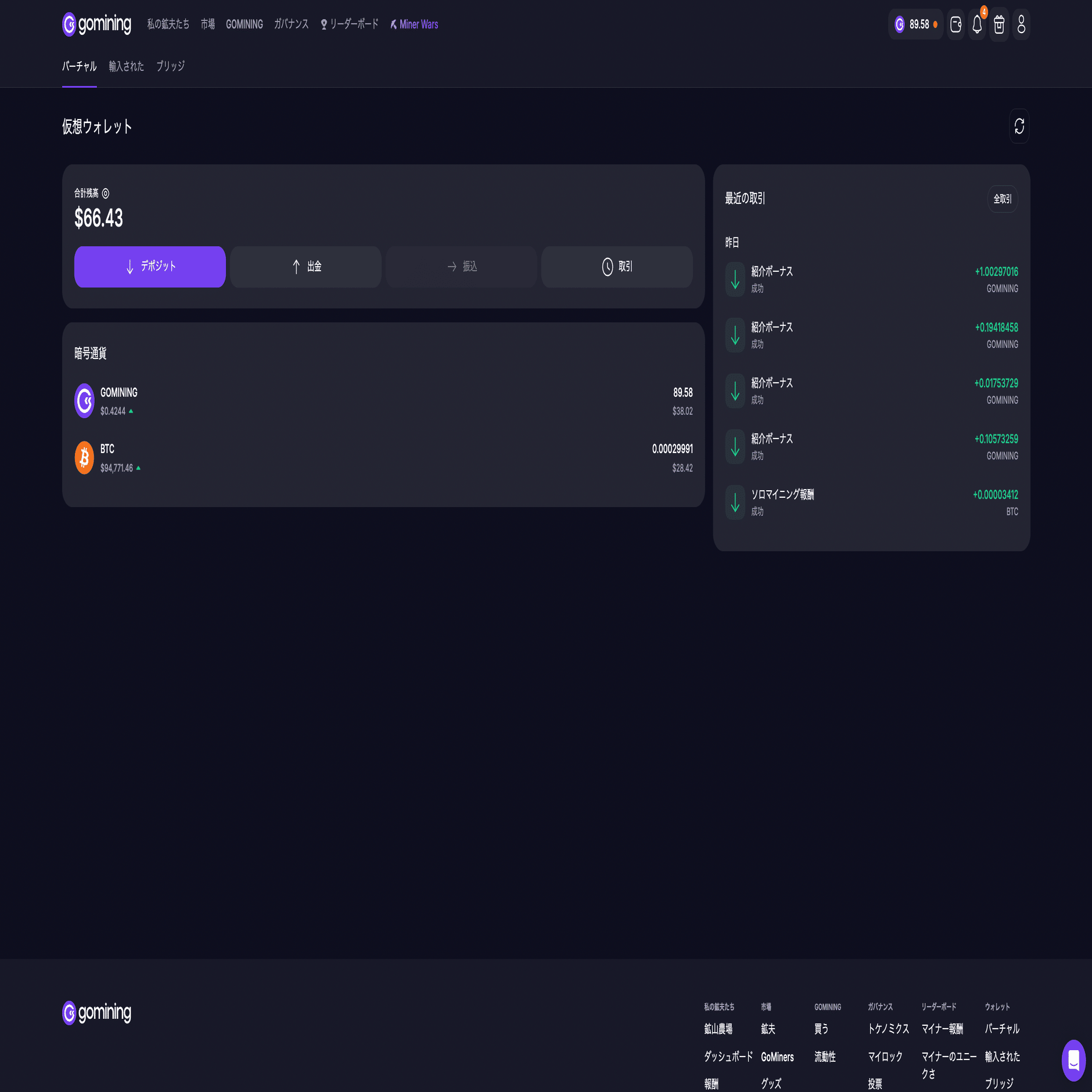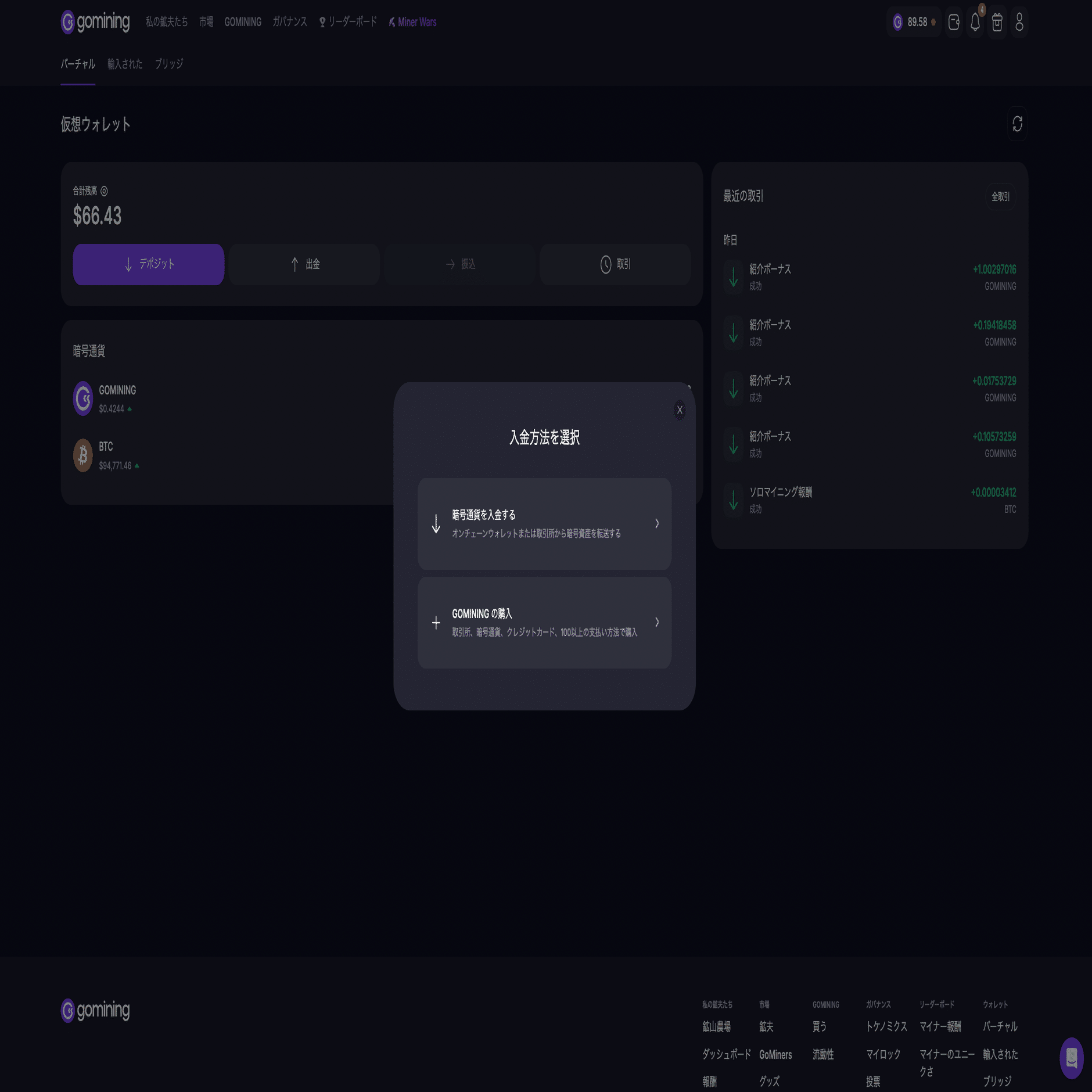 最後にGominingアプリの仮想ウォレットに送金する手順を