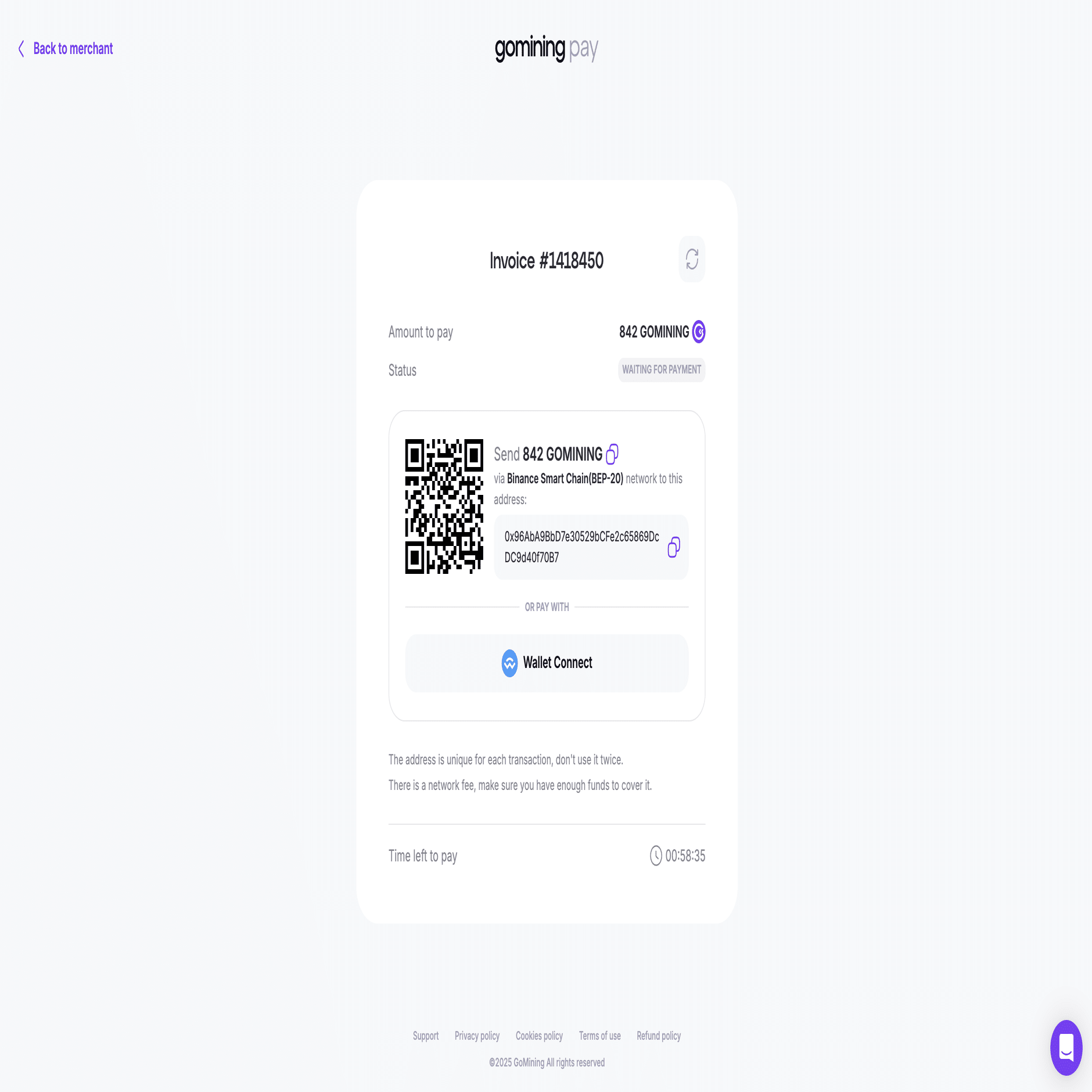 進めると、QRコードまたはアドレスが表示されるのでQRコードを読み取るか、アドレスをメタマスクの送金画面にコピペすることで資金を移動できます。