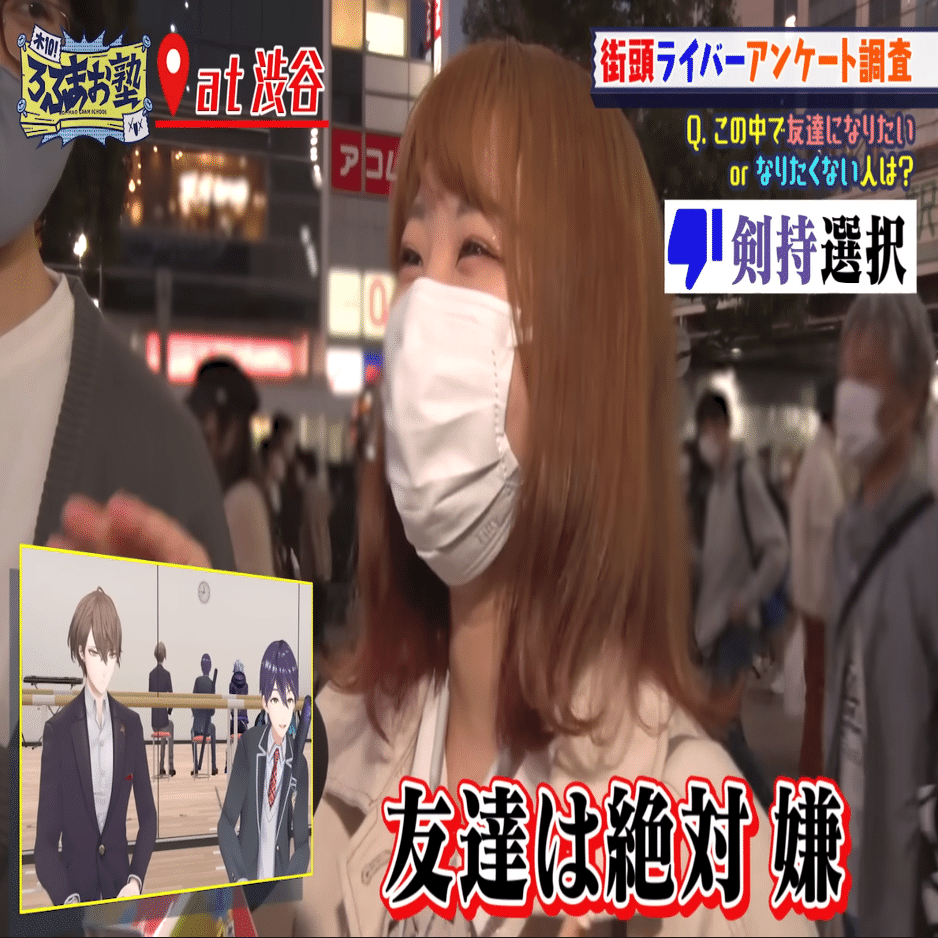 あと、「友達になるなら誰?」という質問に対して、ろふまおを知っている女性が「(剣持が友達なのは)絶対 嫌」と言っていたのが、めちゃくちゃわかる。剣持刀也が面白い人なのは理解している。だが、友達にいたら絶対に嫌だ。これだけは本当によくわかる。街頭インタビュー回、熱すぎる。