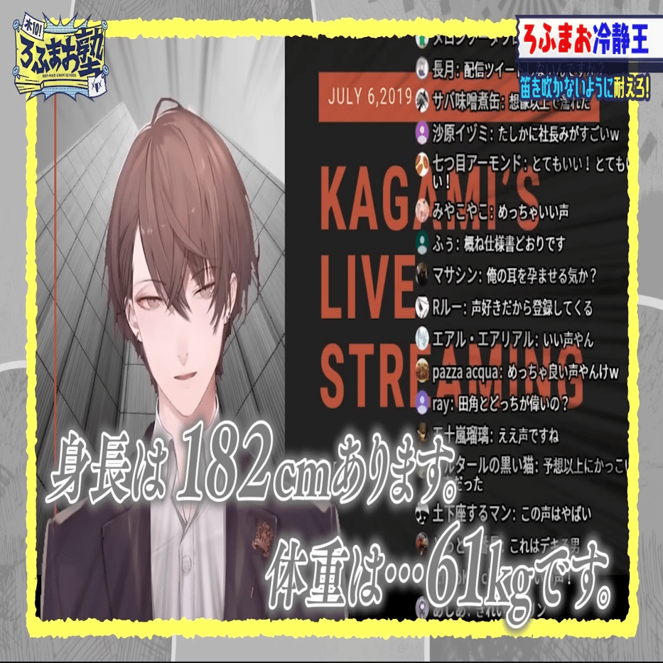 神妙な声で「身長は182cmあります。体重は……61kgです。」と言っているのも面白い。AVの自己紹介? 私がそこまで深くVTuber文化に触れていなかったのもあって、こういう「初配信時と現在のキャラが違いすぎる」みたいな現象を見るのもなんか新鮮でした。にしても初登場時の飛影すぎる。