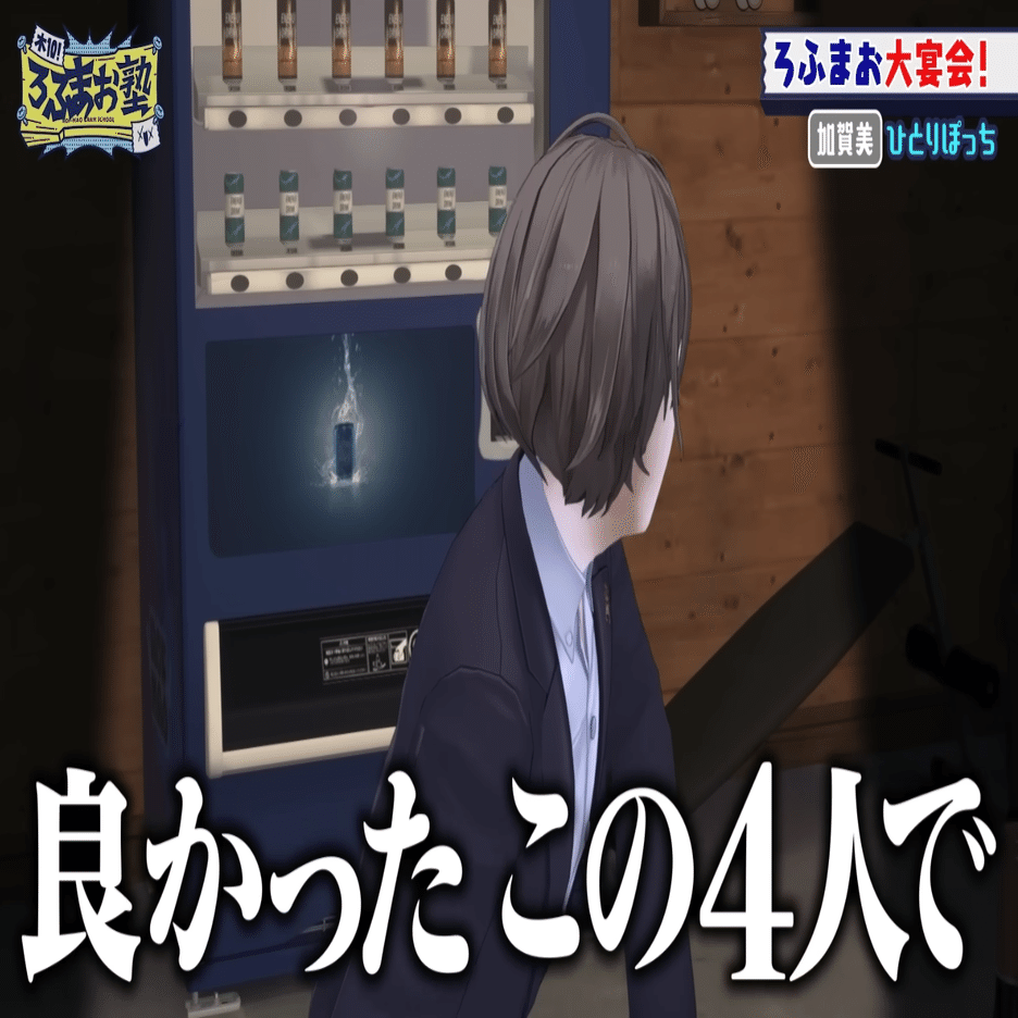 ベロベロに酔っぱらった甲斐田がずっと「ろふまおは最高だあ!!」「社長に一生ついていくよ」みたいなこと言ってるのも泣けるし、社長が想像以上に「ろふまおのリーダー」として熱い信念を持ってるのも泣けるし、甲斐田に「このカス!!」呼ばわりされて結構嬉しそうにしてる剣持にも泣けるし、ふわっちは潰れて床で寝てる。これこそ「ろふまお」なんですよ。