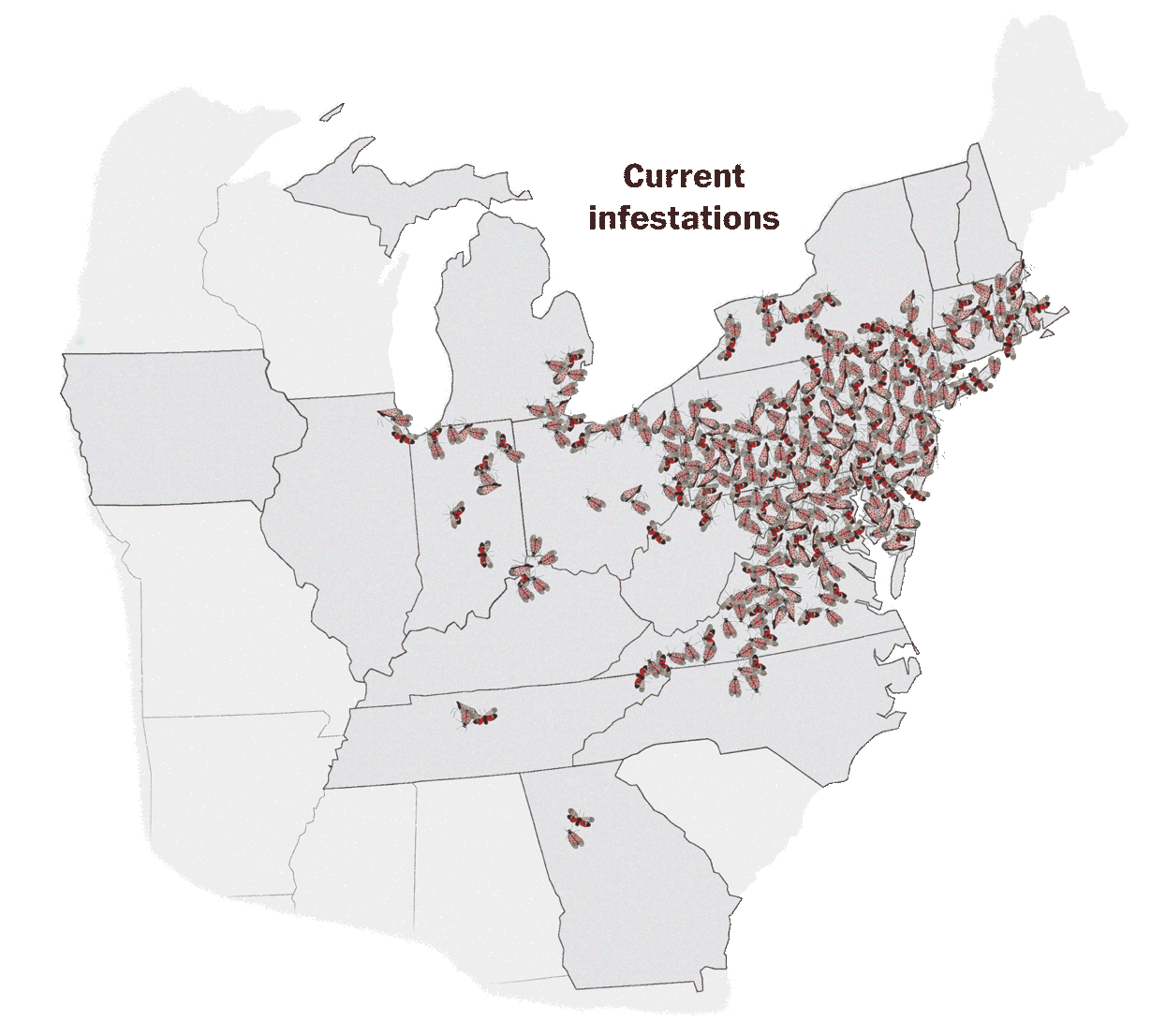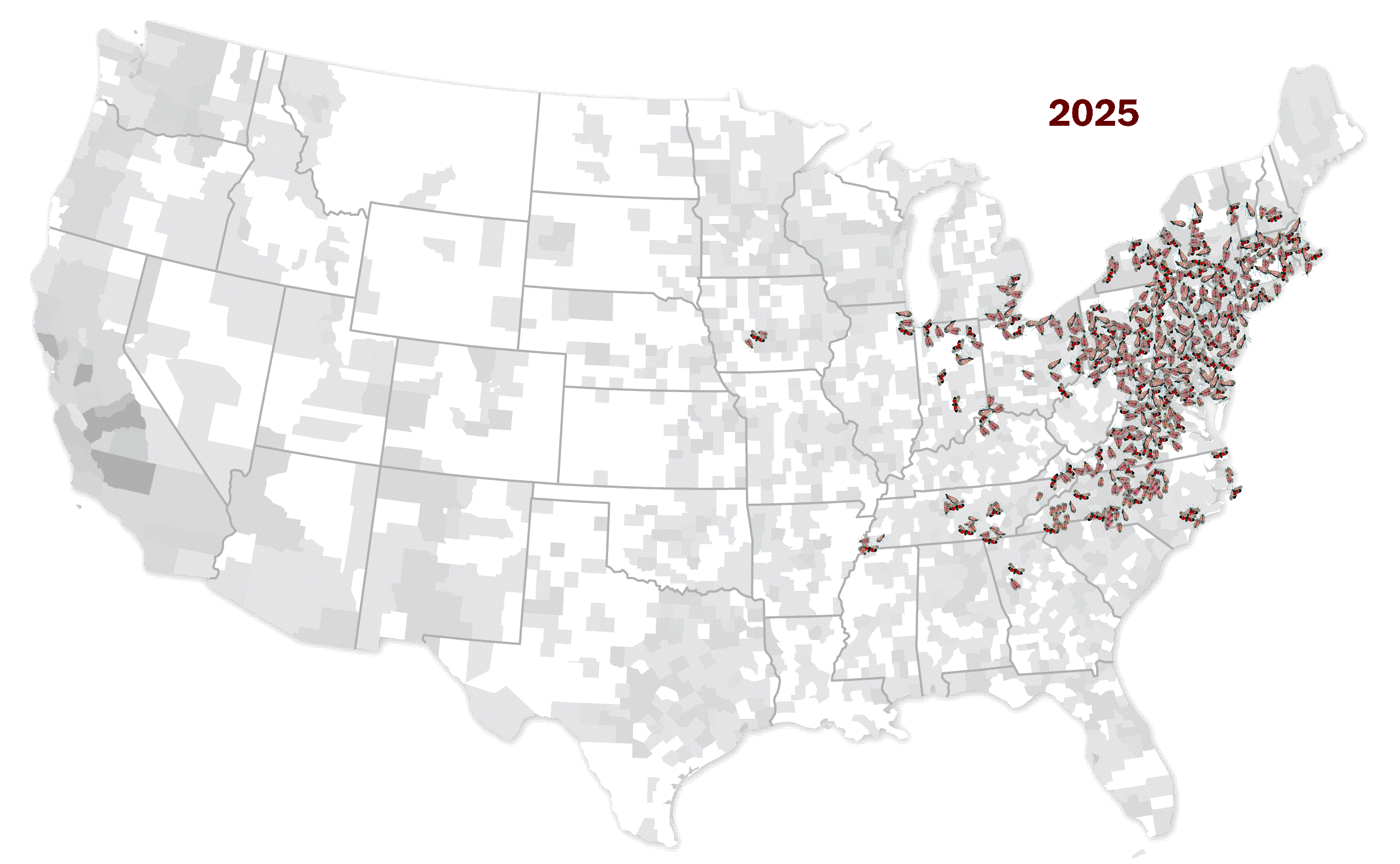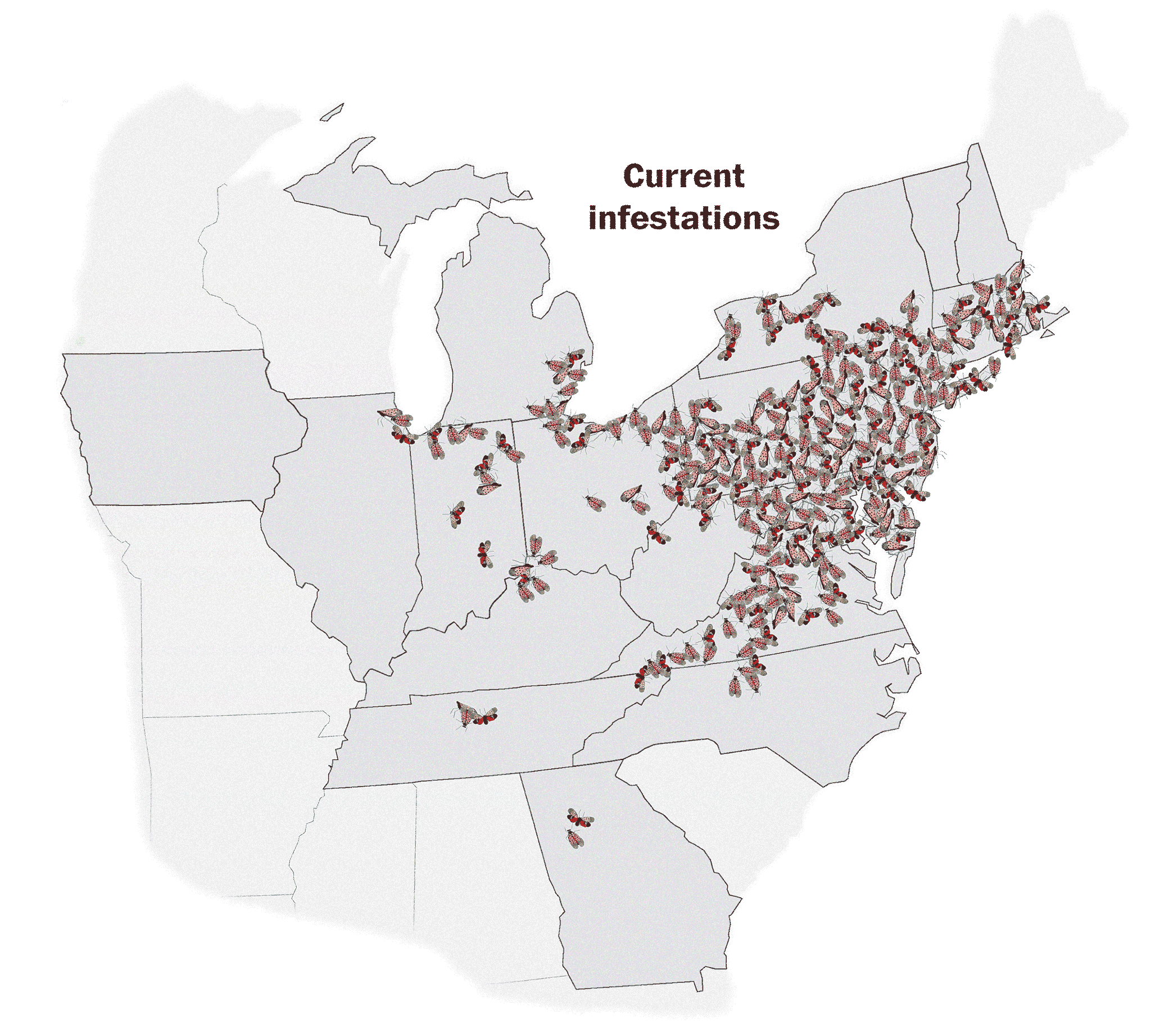 By January 2018, remnants of spotted lanternflies were discovered in Winchester, Virginia. Scientists suspect the insects hitchhiked on products imported from neighboring Pennsylvania.