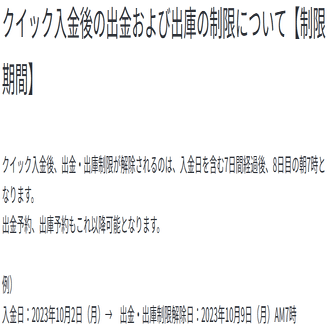 なんとSBI VCトレードはクイック入金後、7日間の出金・出庫を停止する仕様があります。※マネロン対策。国内取引所では一般的な仕様