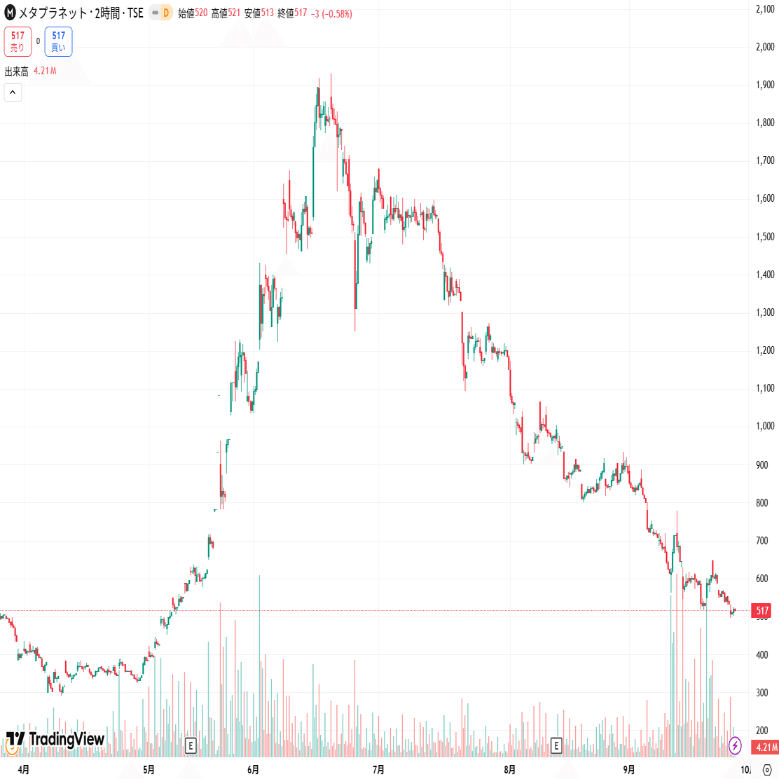 この時はちょうどメタプラバブルが天井をつけて、下に向かい始めた頃ですね。当時はビットコインの仕組みすら何も理解していなかったため、メタプラの株を購入することはありませんでした。