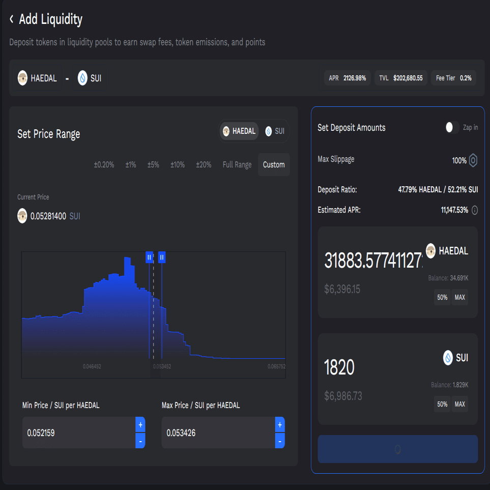 説明すると長くなるので省略しますが、HaedalとSUIの集中流動性プールに預けて、レンジが外れ次第組み直すというのを繰り返していました。そんなこんなしていたら、Haedalの価格はさらに上昇。