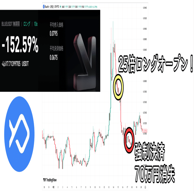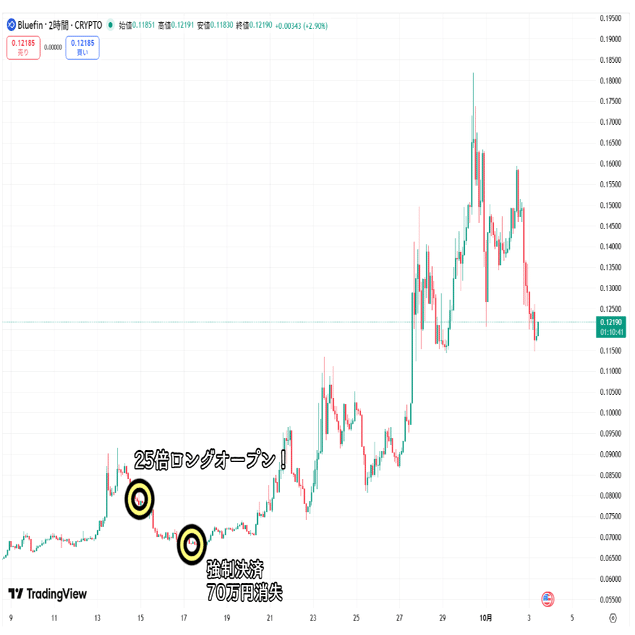 発表があってからBlueトークンは急騰。さすがに頂点で買うのは怖かったので、少し下がったところでレバレッジをかけてポジションを組みました。
