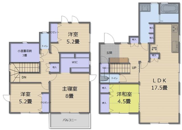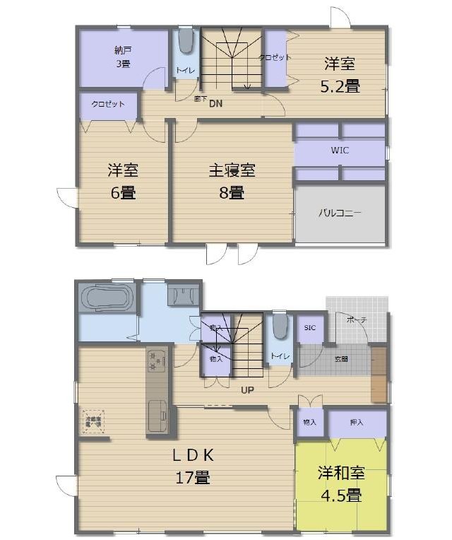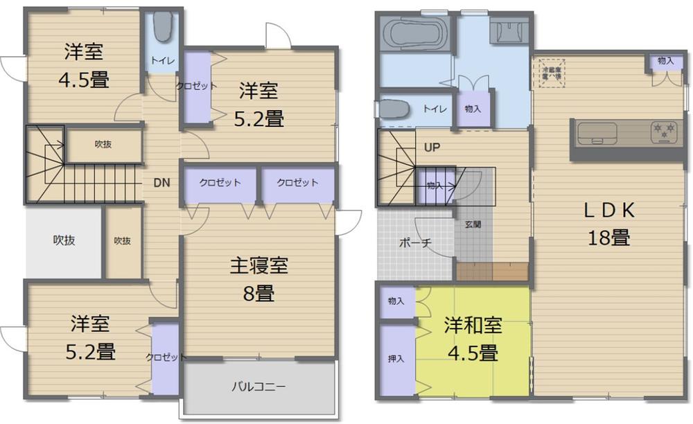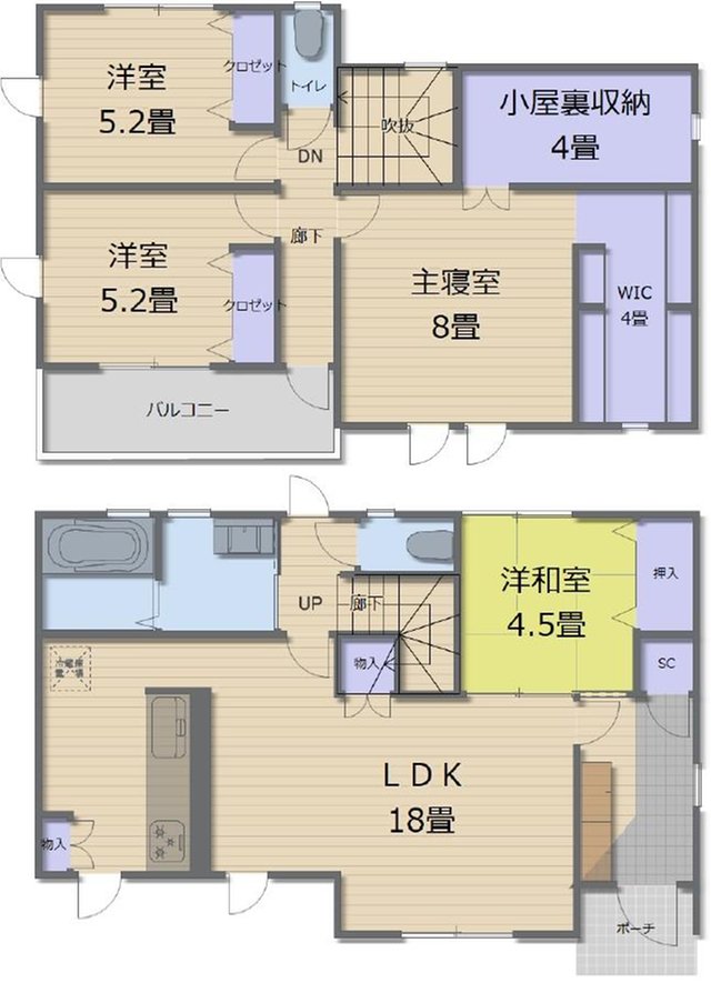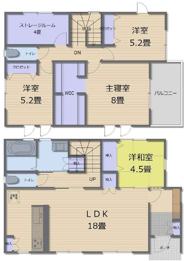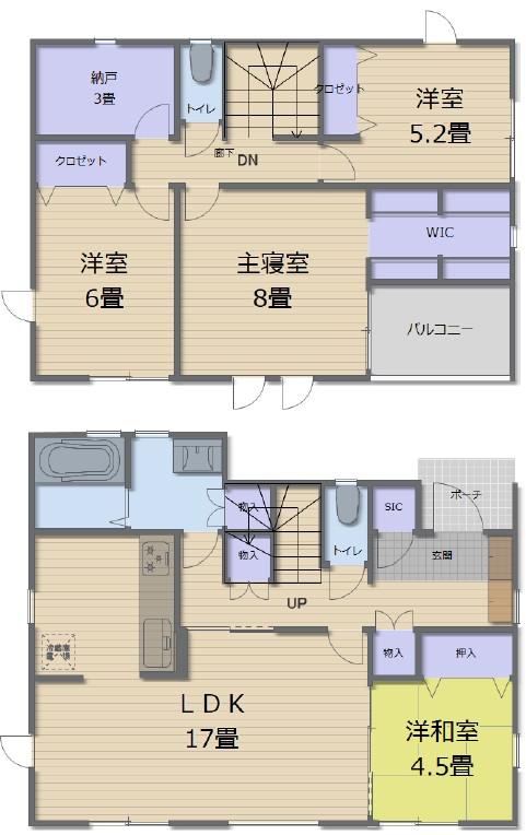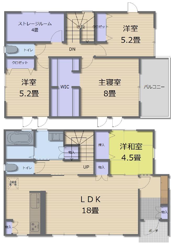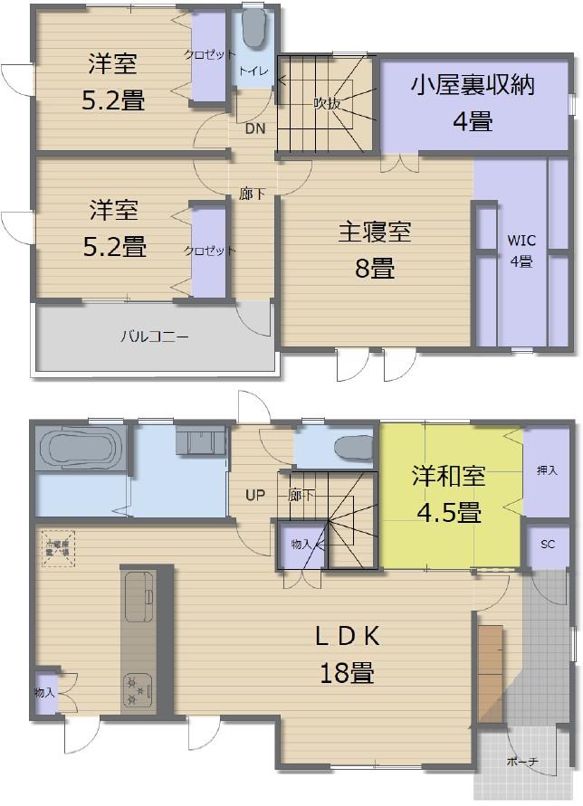 | 間取り | 全居室収納、LDK15畳以上、2階建、ウォークインクローゼット、シューズインクローク、屋根裏収納、納戸 |