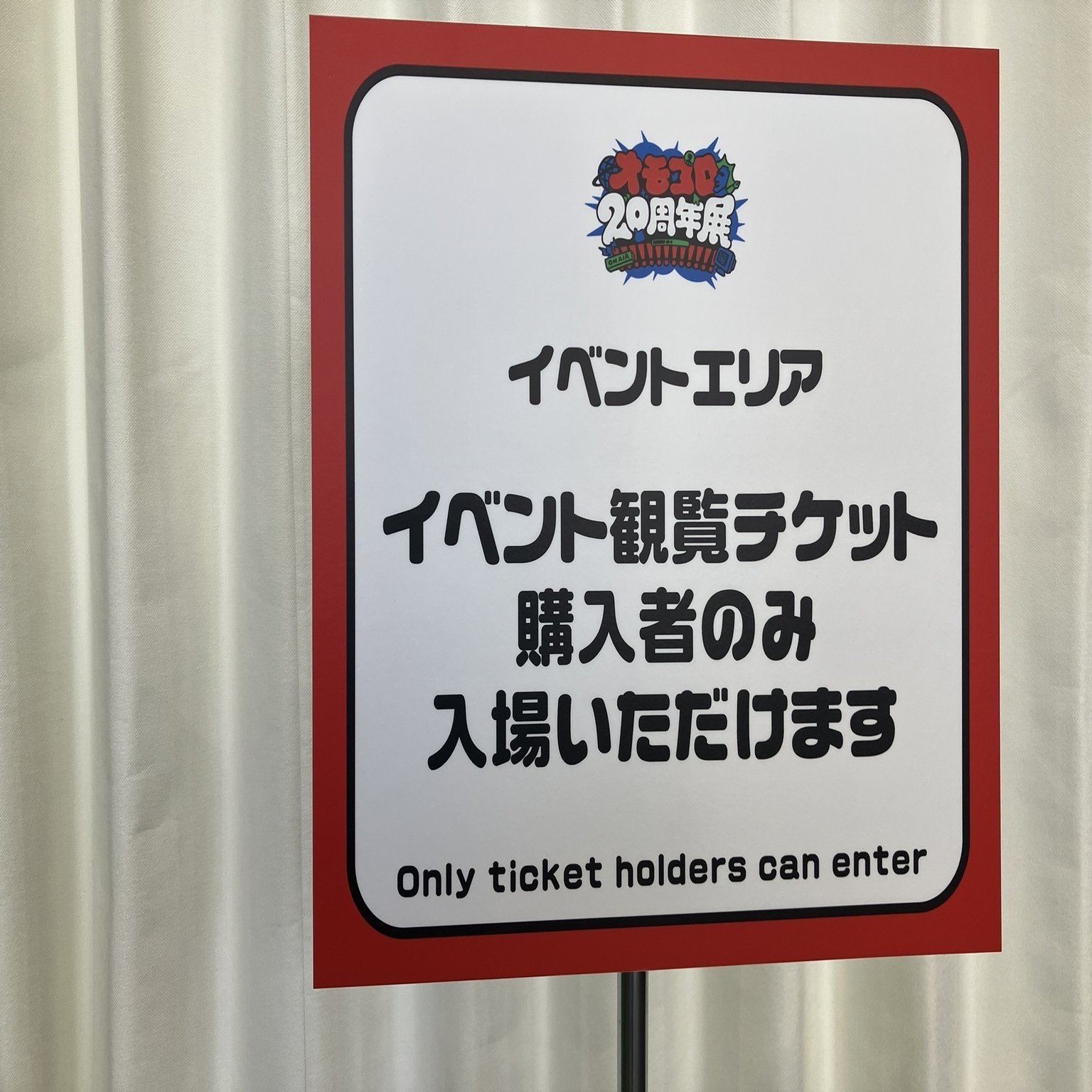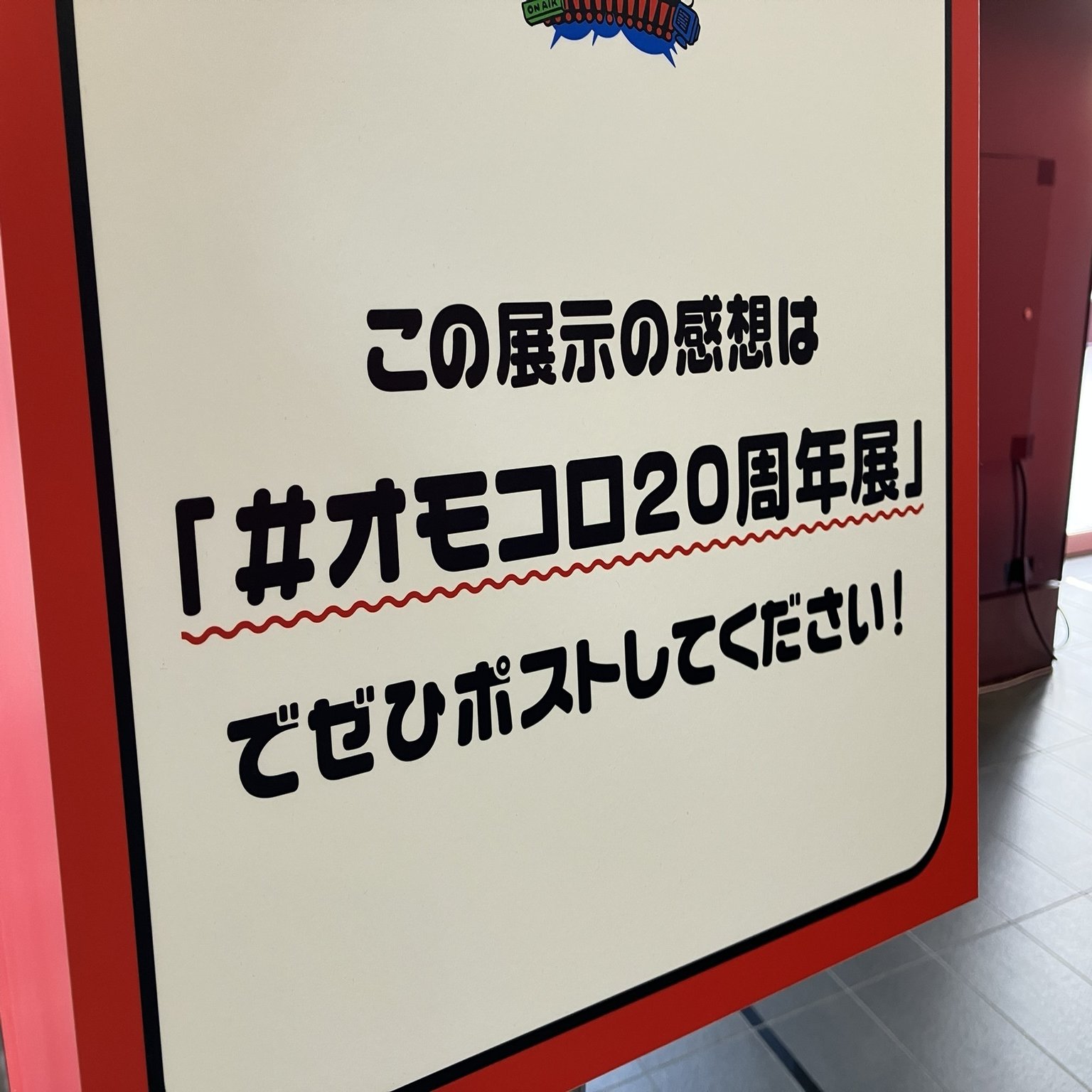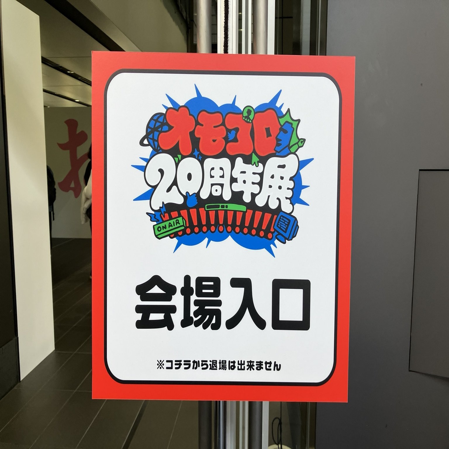 いきなり『オモコロ20周年展!!!!!!!!!!!!!』の大看板がお出迎え。