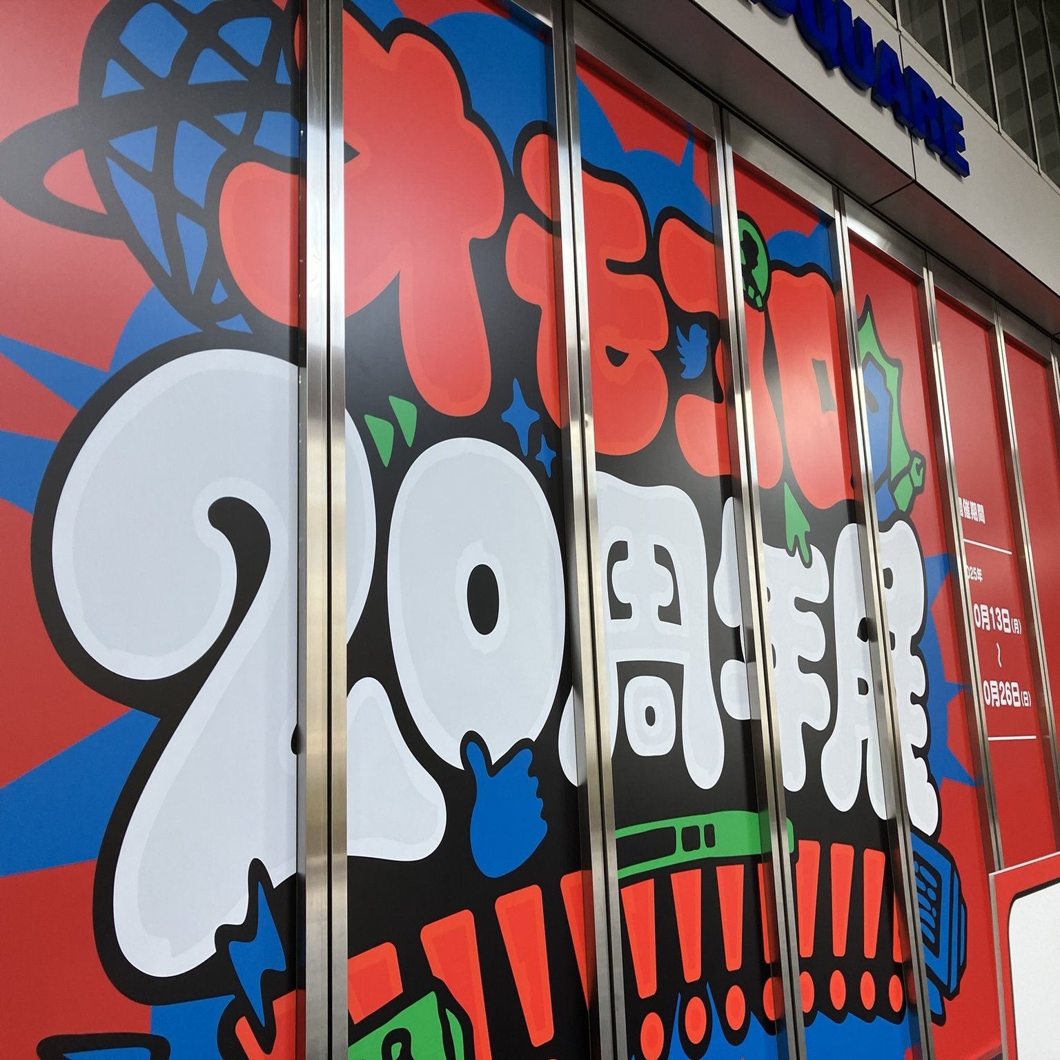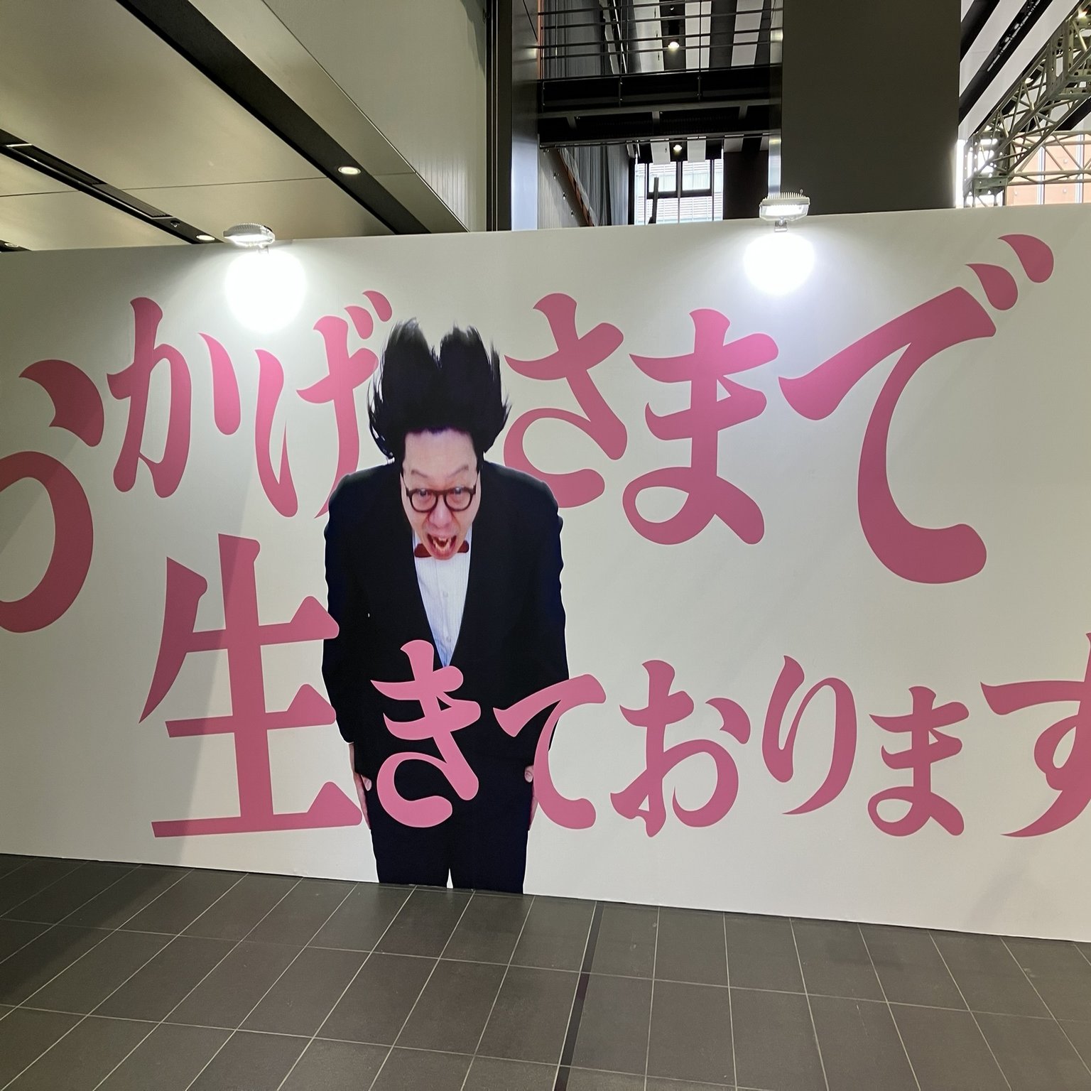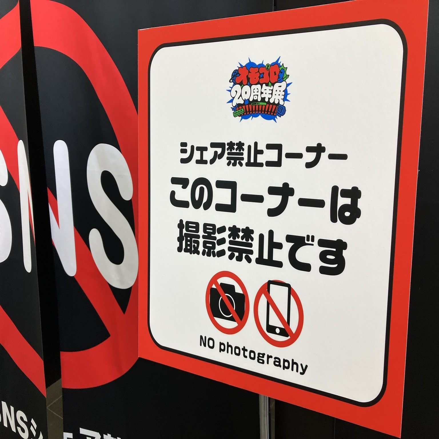 いきなり『オモコロ20周年展!!!!!!!!!!!!!』の大看板がお出迎え。