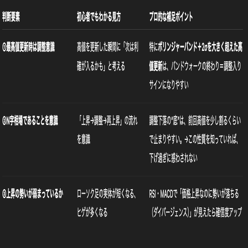・特にボリンジャーバンド+2σを大きく超えた高値更新は、バンドウォークの終わり=調整入りサインになりやすい