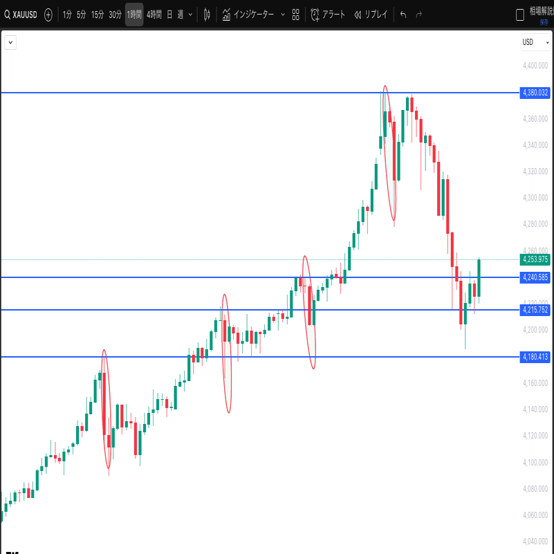 画像にある赤丸(下落ポイント)を分析すると、どれも以下の共通パターンが見られます