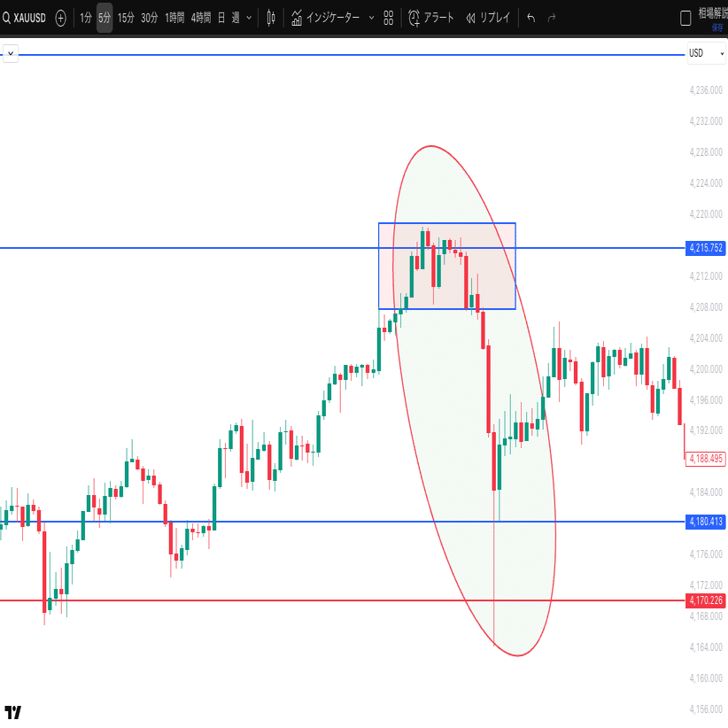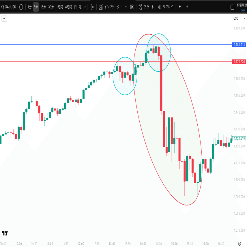 画像を見てわかるように、5分足にするとここまで上げ続けた相場が、4170付近で勢いを無くしています。