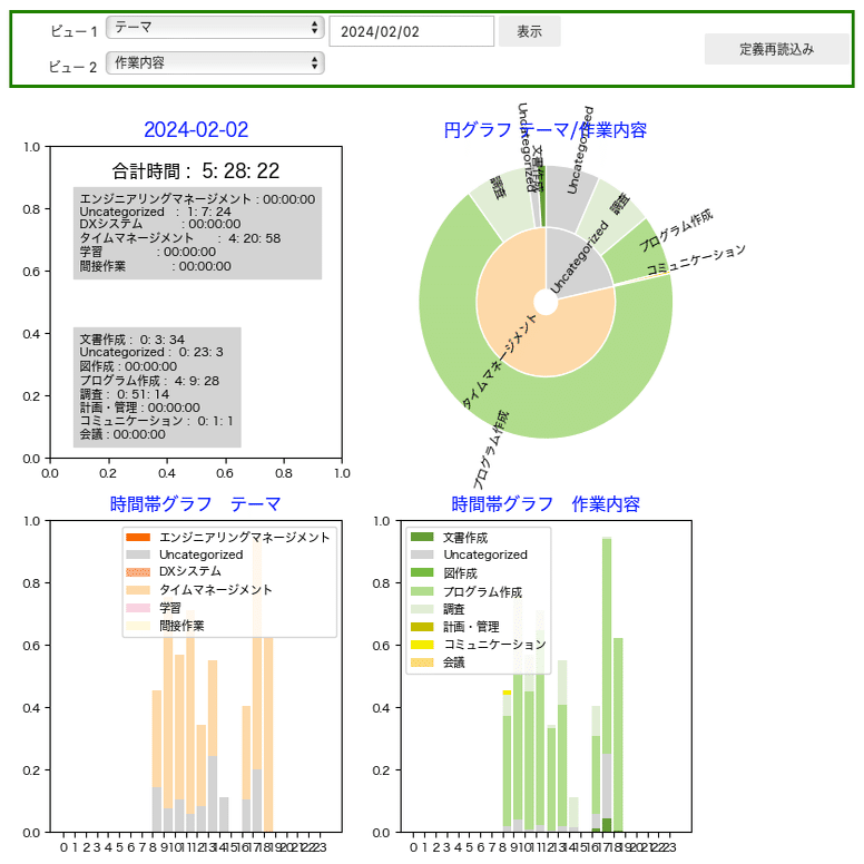「文書作成」「プログラミング」「会議」「学習」など作業項目によって分類